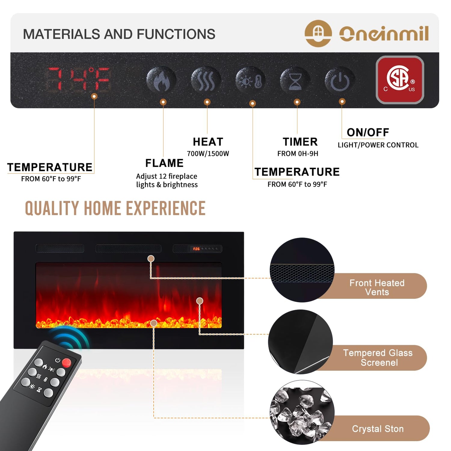 - Safe & Energy-Efficient Fireplace: Heats up to 400 sq. ft., adjustable temp, overheat protection, & CSA/ETL certified. LED flame technology saves energy with auto-shutoff timer.