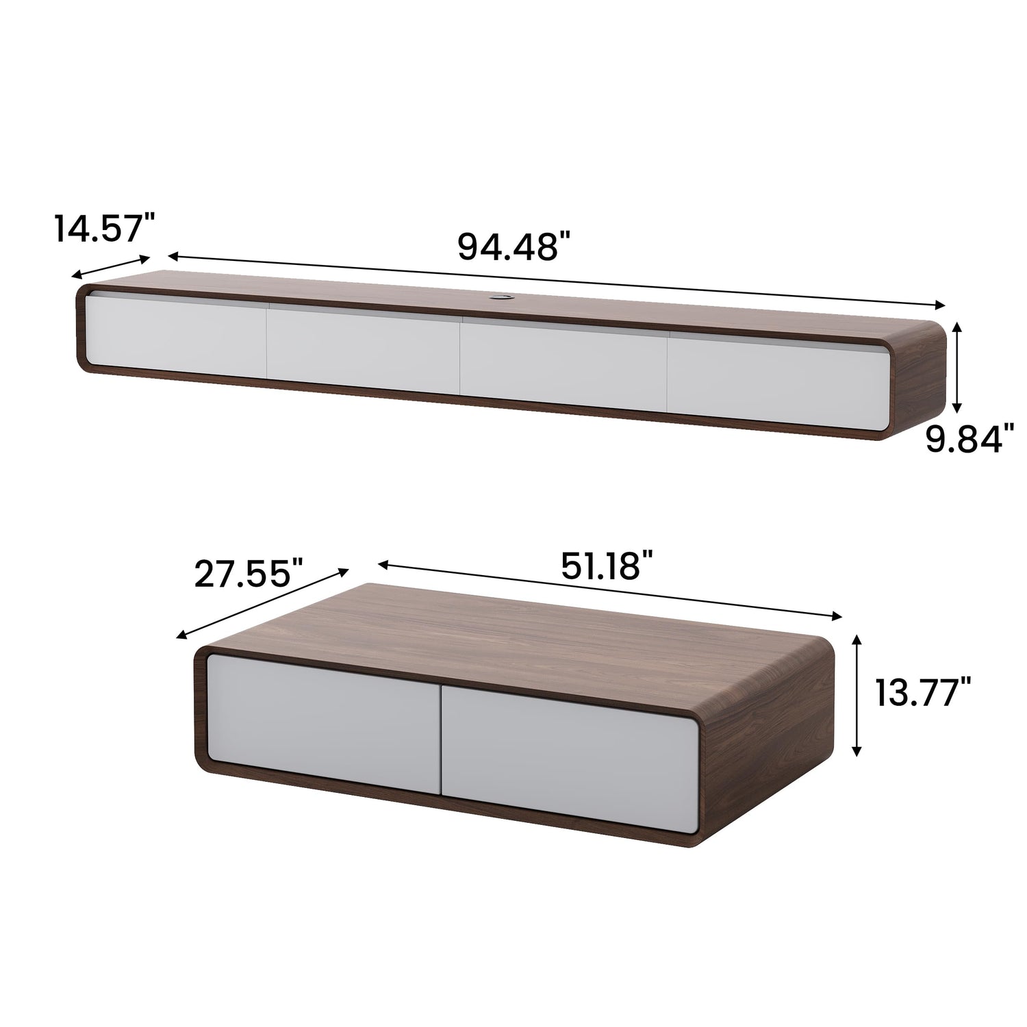 POVISON Mid Century Modern TV Stand and Coffee Table Set of 2, Minimalist Floating TV Stand 95" Modern Wall-Mounted Entertainment Center, 51" Square Wood Coffee Table, Walnut & White