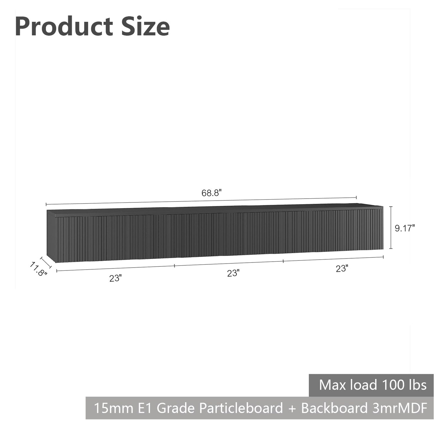 • High Quality and Sturdy Structure: This floating TV cabinet is made of 15mm E1 grade particleboard and backboard 3mm MDF, which is strong, waterproof and easy to clean, offering you a safe and healthy living environment. The suspended TV console can bear 100 pounds, allowing you to place more equipment. Your appliance will be kept safe and sound. Product Dimensions: 68.8"W x 11.8"D x 9.17"H.
