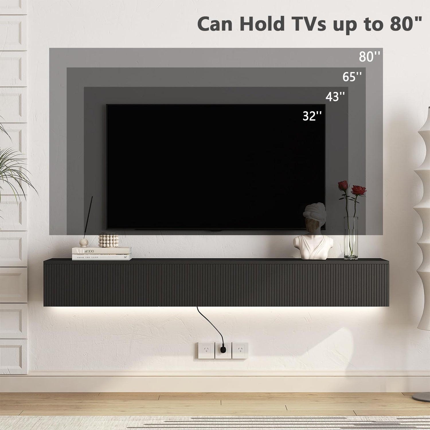 Resenkos Floating TV Stand, Wall Mounted TV Shelf with Led Lights & Power Outlet, Modern Entertainment Center with Storage, 68.8'' Media Console TV Stands for Living Room, Bedroom, Black