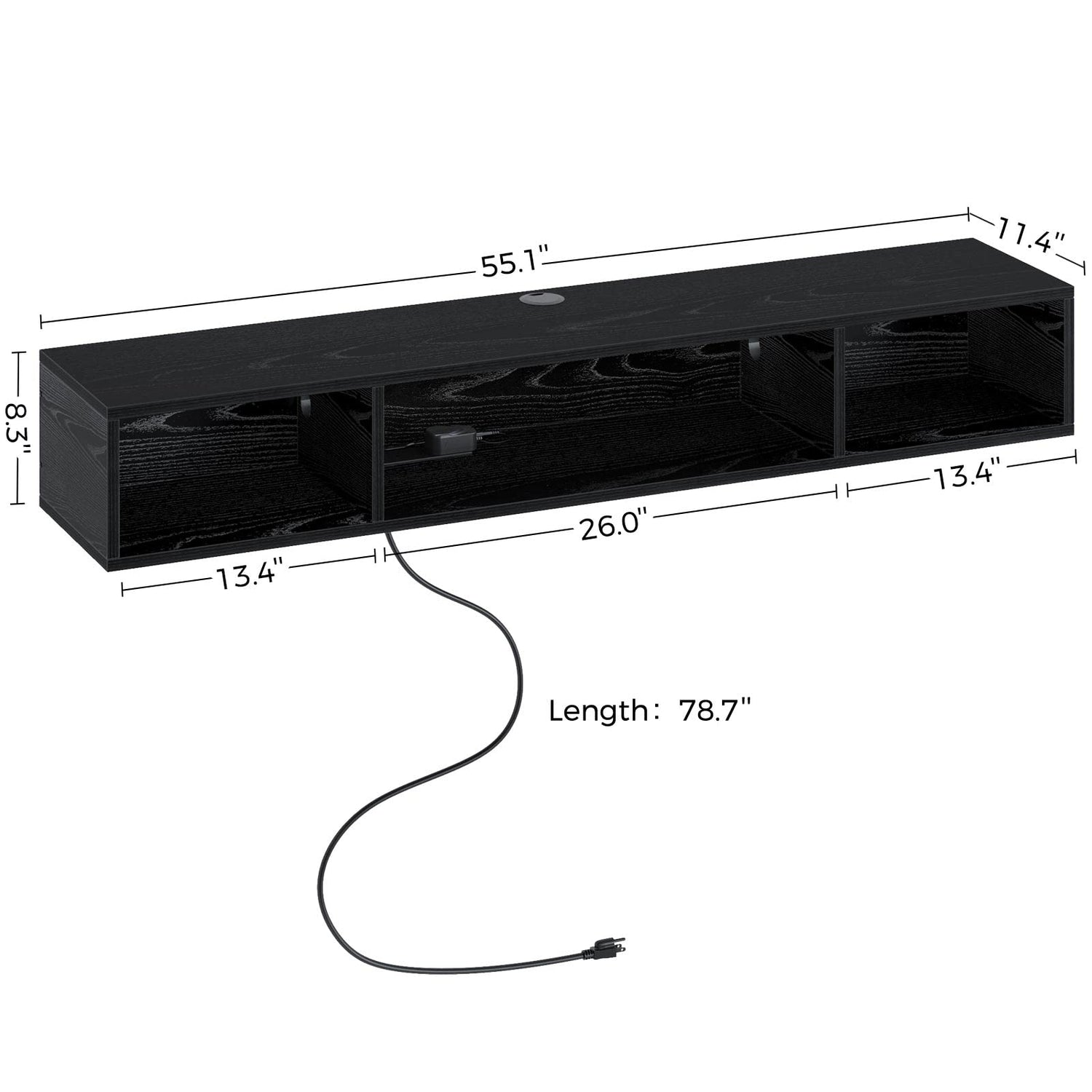 - Open Display Shelf: The unique wall-mounted design frees up valuable floor space, perfect for living rooms, bedrooms, entertainment center. The 55.1" long media stand features 3 open shelf providing storage space for your books, electronic devices, and media equipment. You can also showcase your decorative items and favorite family photos on the top space of the stand. Product Dimensions 55.1"W x 11.4"D x 8.3"H