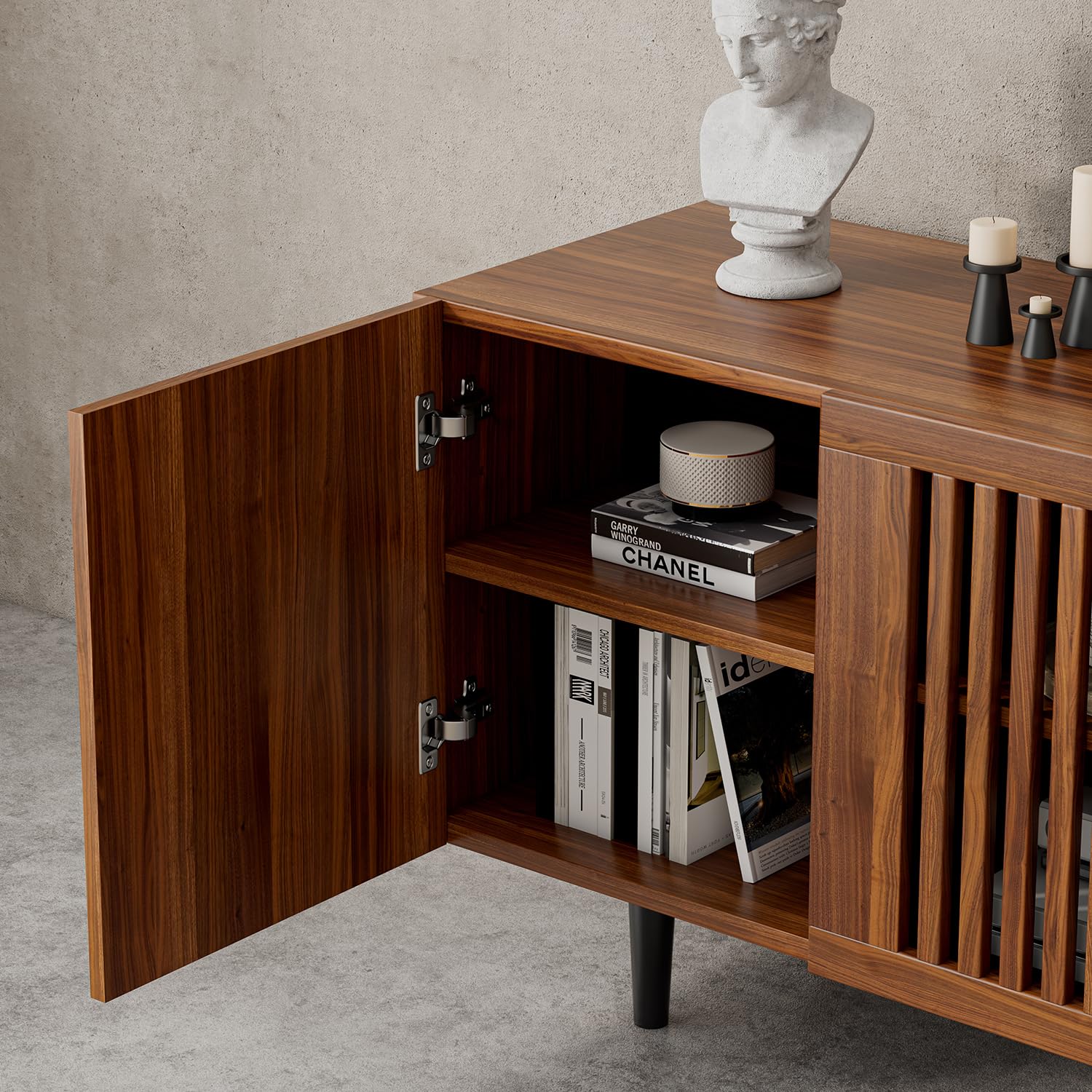 - Stylish and Functional Design: This farmhouse brown TV stand features a sleek design that enhances any living room decor; The unique grille-striped doors add an elegant touch while providing essential storage for your entertainment center