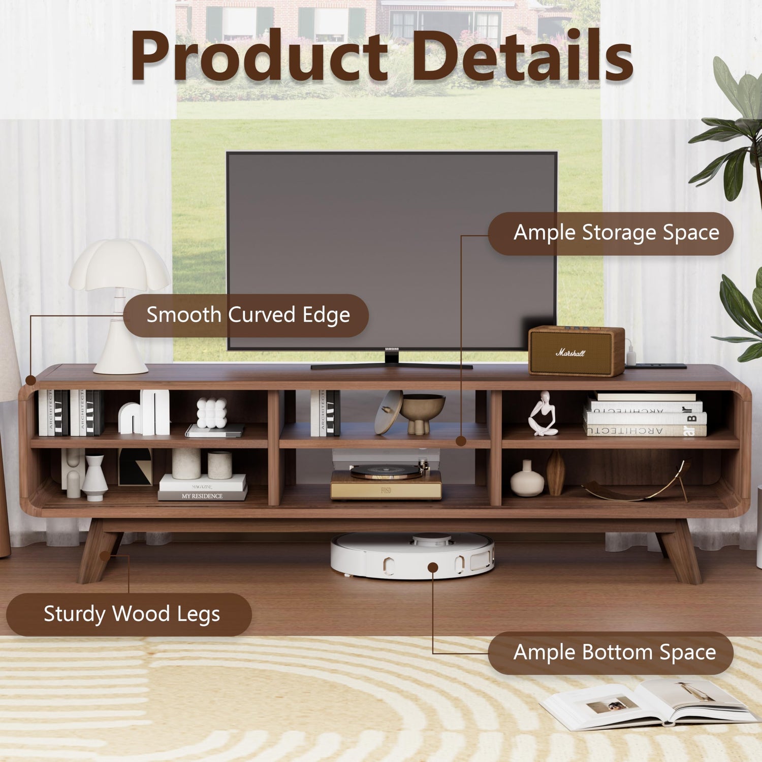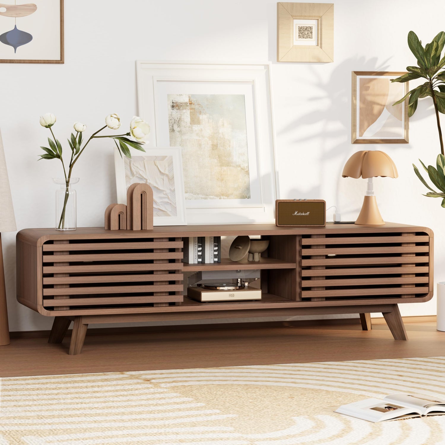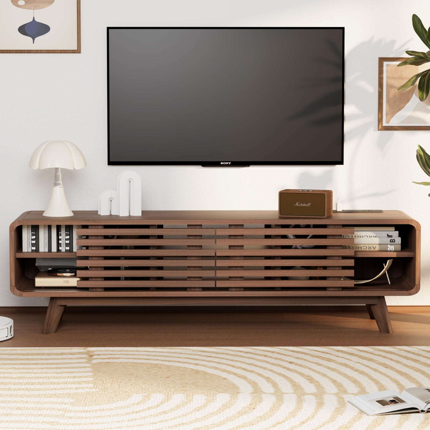• Unique Design: This TV stand features a wood-textured particleboard frame and slatted sliding doors that partially conceal two shelf units. The design is unique and elegant. Rounded corners soften the streamlined appearance of the frame, providing a safe environment for children.