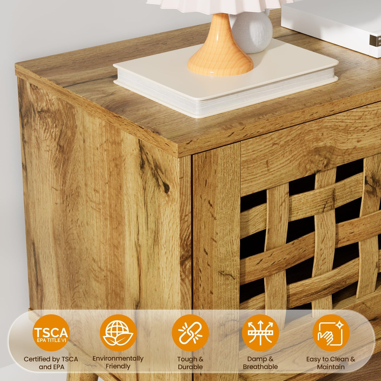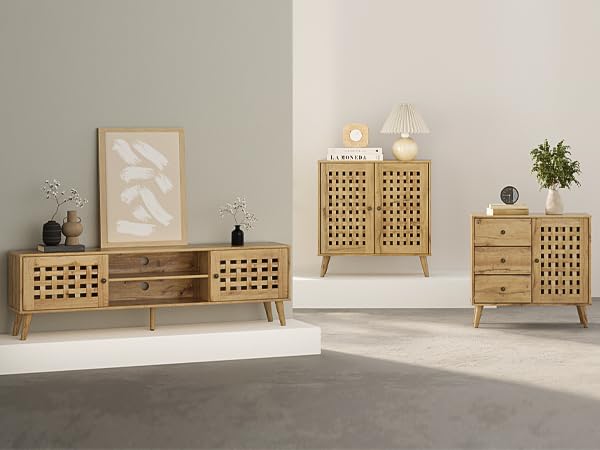 - Exquisite and Breathable Design: Our Mid Century Modern TV Stand for 55 inch TV has basket weave wooden door, with small perforations, promotes airflow to keep interiors dry. Our wood tv stand would be lovely to paired with ethnic murals, a thick carpet and some lively green plants, reflecting the owner's attention to life details.