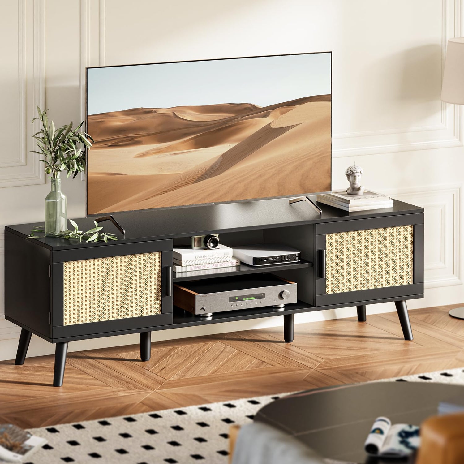 - [Eye-pleasing and Versatile]: Black finish and rattan drawer make this boho TV stand a modern and elegant piece, matching any home decor. Whether used in the entryway or hallway as a consle cabinet, or in the living room as a TV stand, its clean outlook will add taste to where it stays