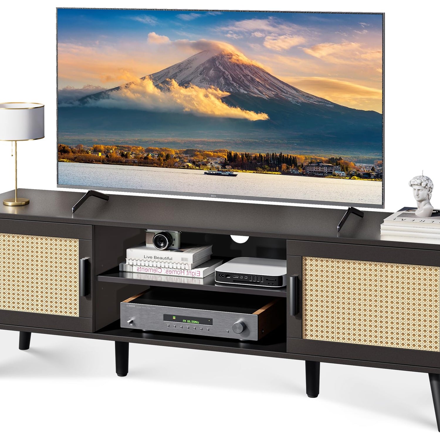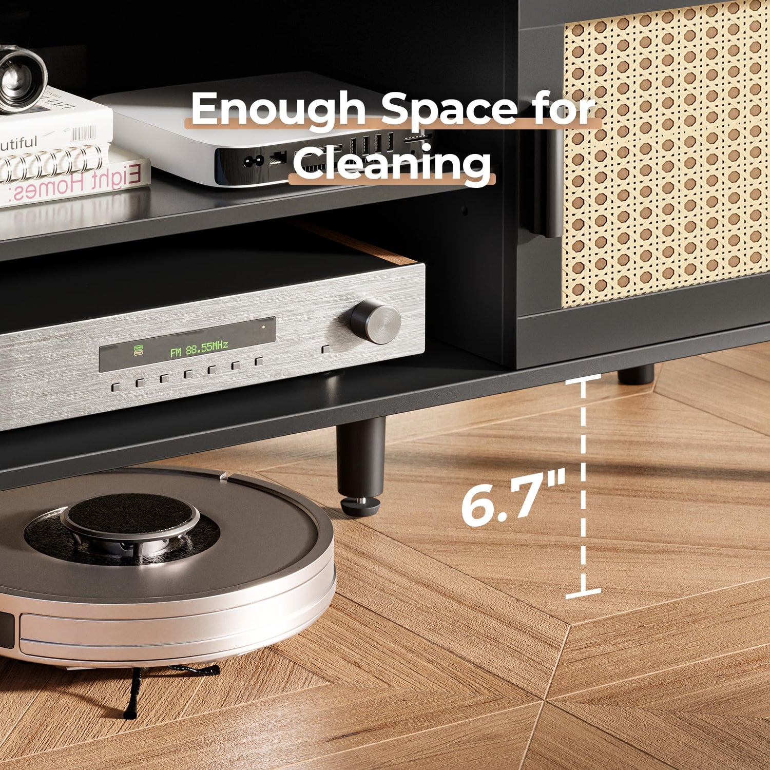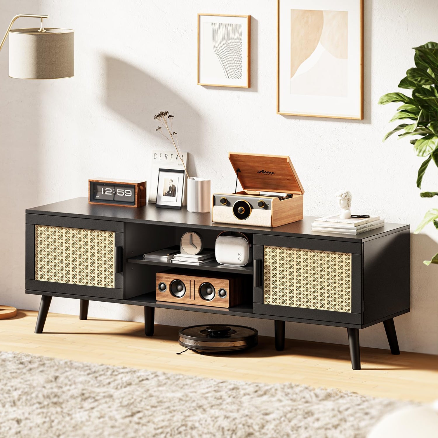 - [Support up to 65 Inches TV]: Suitable for TV up to 55 inches, 60 inches, 65 inches. Prop your TV on this tv entertainment center for strong support or mount your TV on the wall and use this media console cabinet as a decoration table for your TV supplies, ornaments, vases... The black finish adorn with rattan surface elevates modern vibe and enhances your movie nights