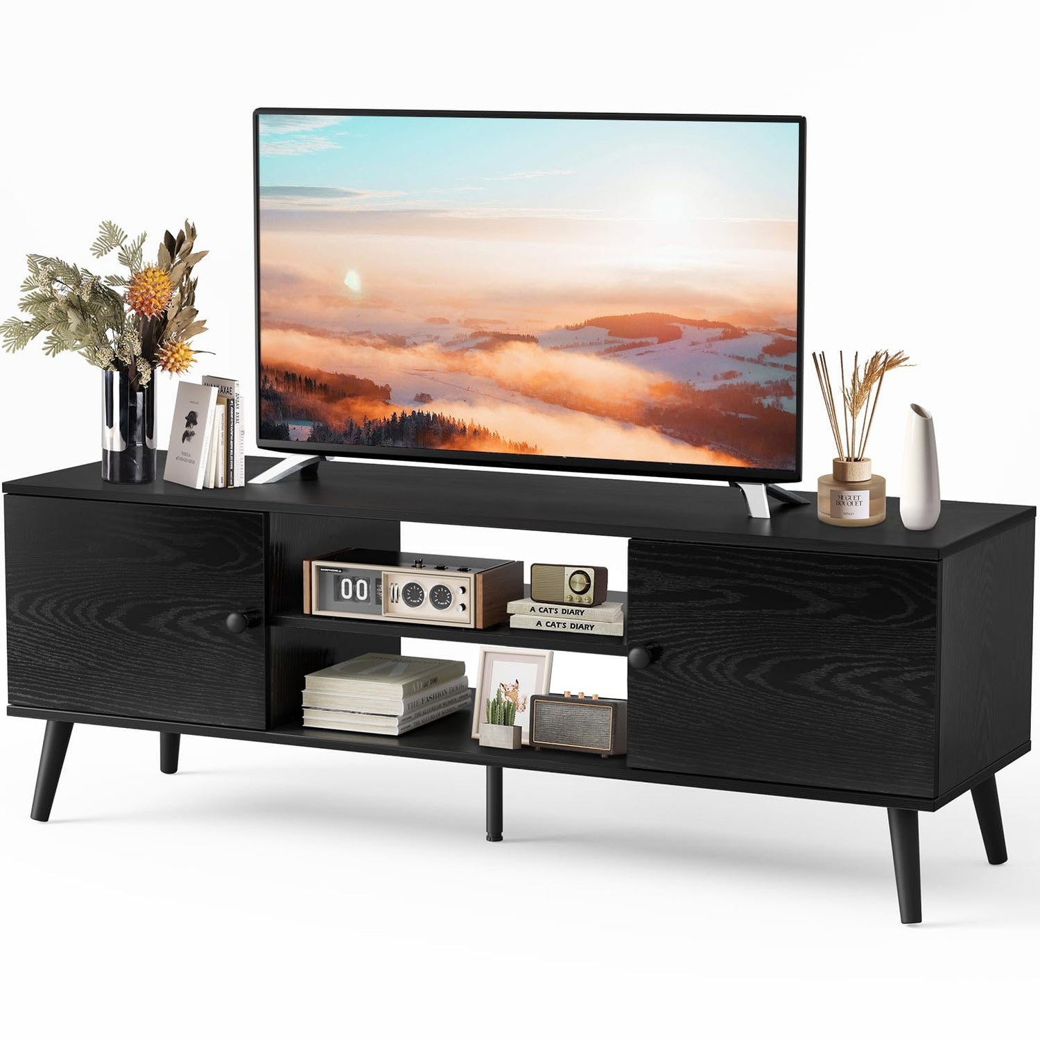 Sweetcrispy TV Stand for 55 60 inch TV, Modern Mid Century Entertainment Center with Storage, Media Console Table 2 Cabinet, Soft Hinge, Handle Door, Wooden Living Room, Office Furniture, Black