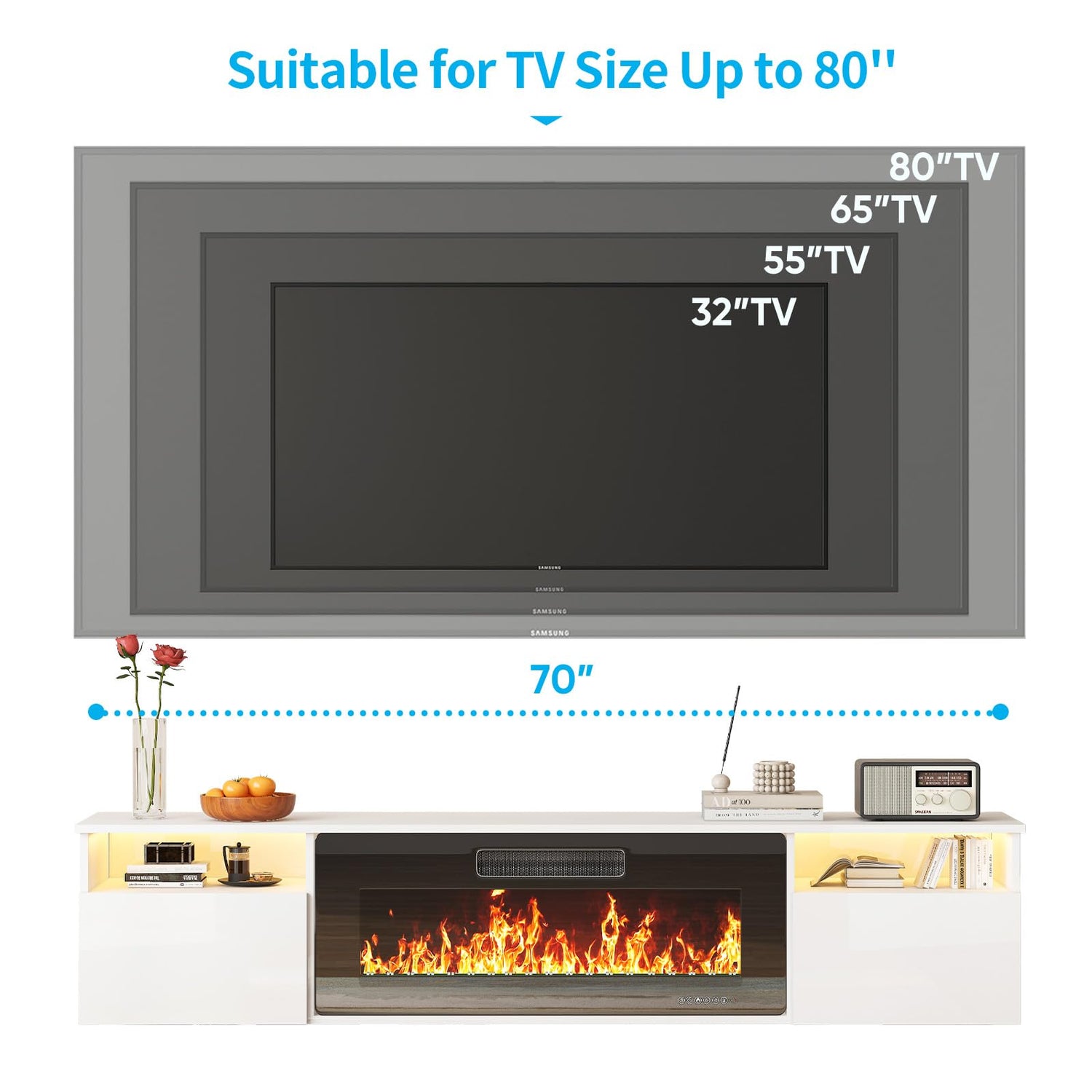 TABU 70" Floating TV Stand with 36" Electric Fireplace Heater, High Gloss Finished Modern Entertainment Center with LED Ambient Light, for TVs Up to 80",Wall-Mounted, White