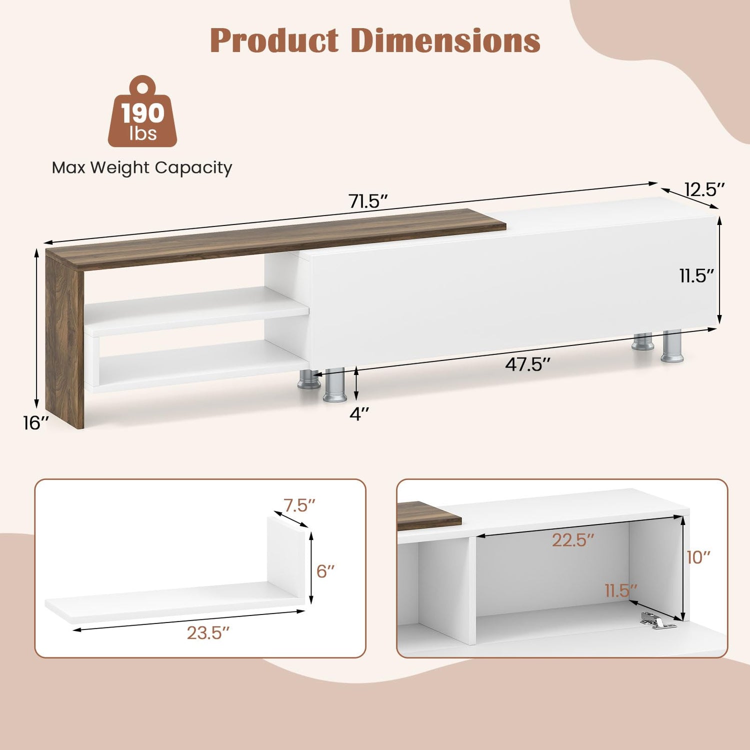 - Large TV Console: Designed to fit TVs up to 80 inches, our 71.5"L x 12.5"W x 16"H console table anchors your entertainment space with style and functionality. Its generous size also makes it an ideal storage organizer for bedrooms, or a stylish display unit for home offices.