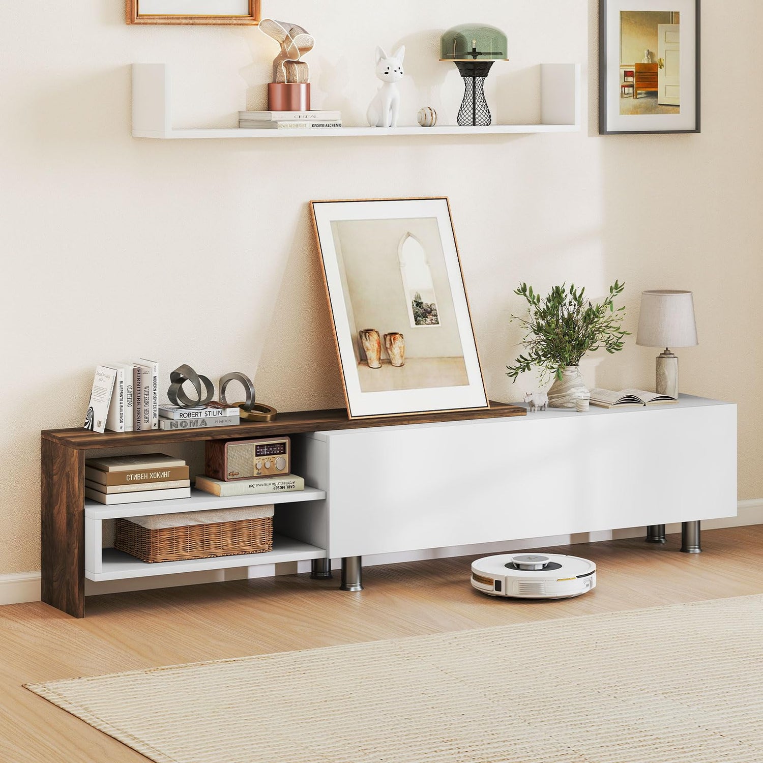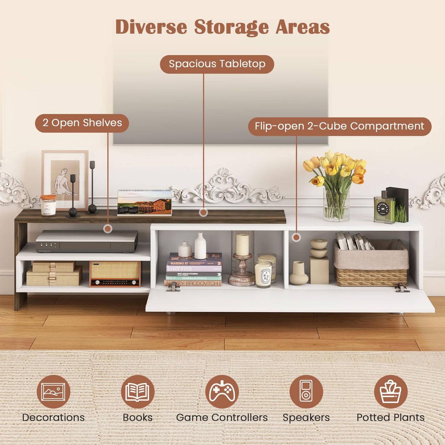 - Diverse Storage Areas: Say goodbye to clutter. Our TV stand features a spacious tabletop for displays, 2 open shelves for frequently used items, and a flip-open 2-cube compartment for your personal belongings, ensuring everything has its designated place.