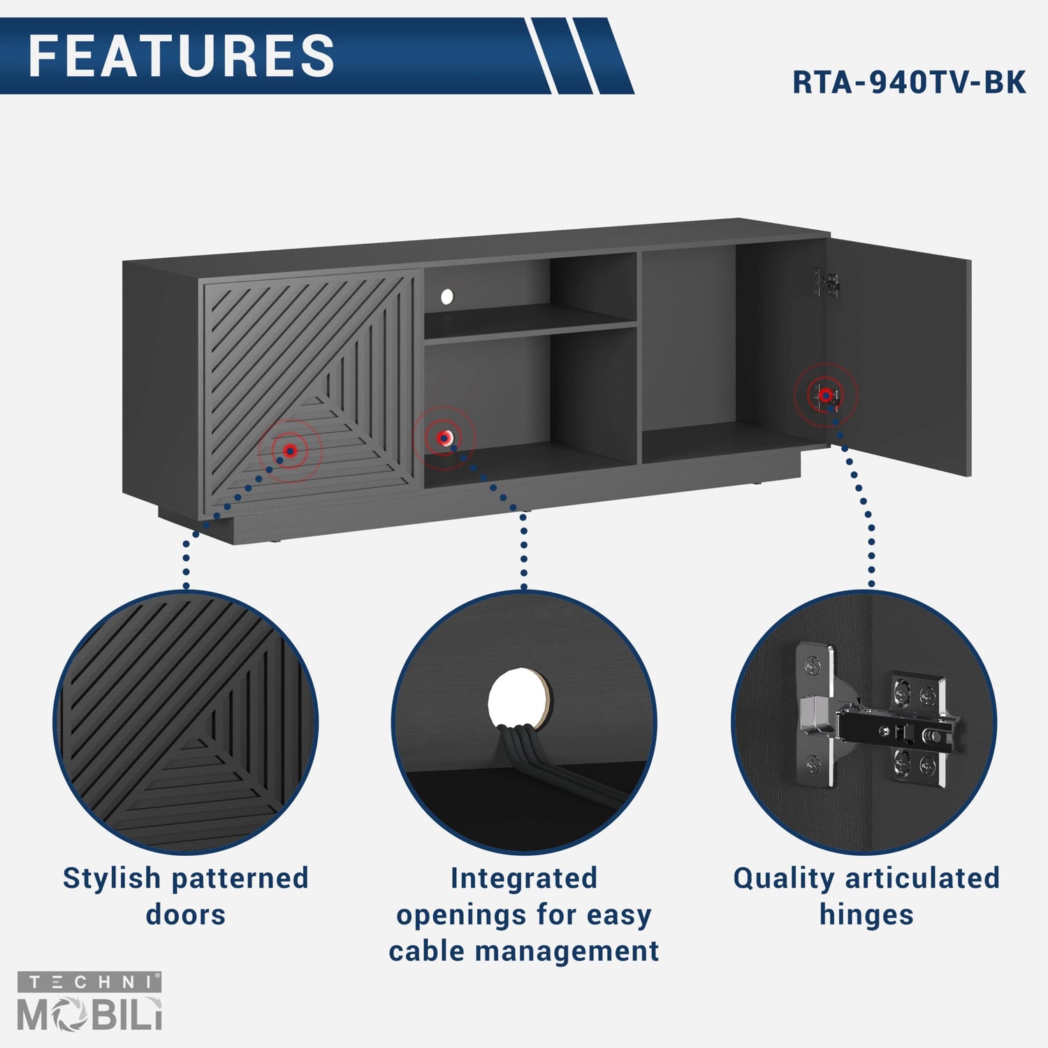 Techni Mobili Modern TV Stand for Screen TVs Up to 70” When Measured Diagonally – Black TV Stand with 2 Storage Cabinets with Patterned Doors and Open Shelves – Black