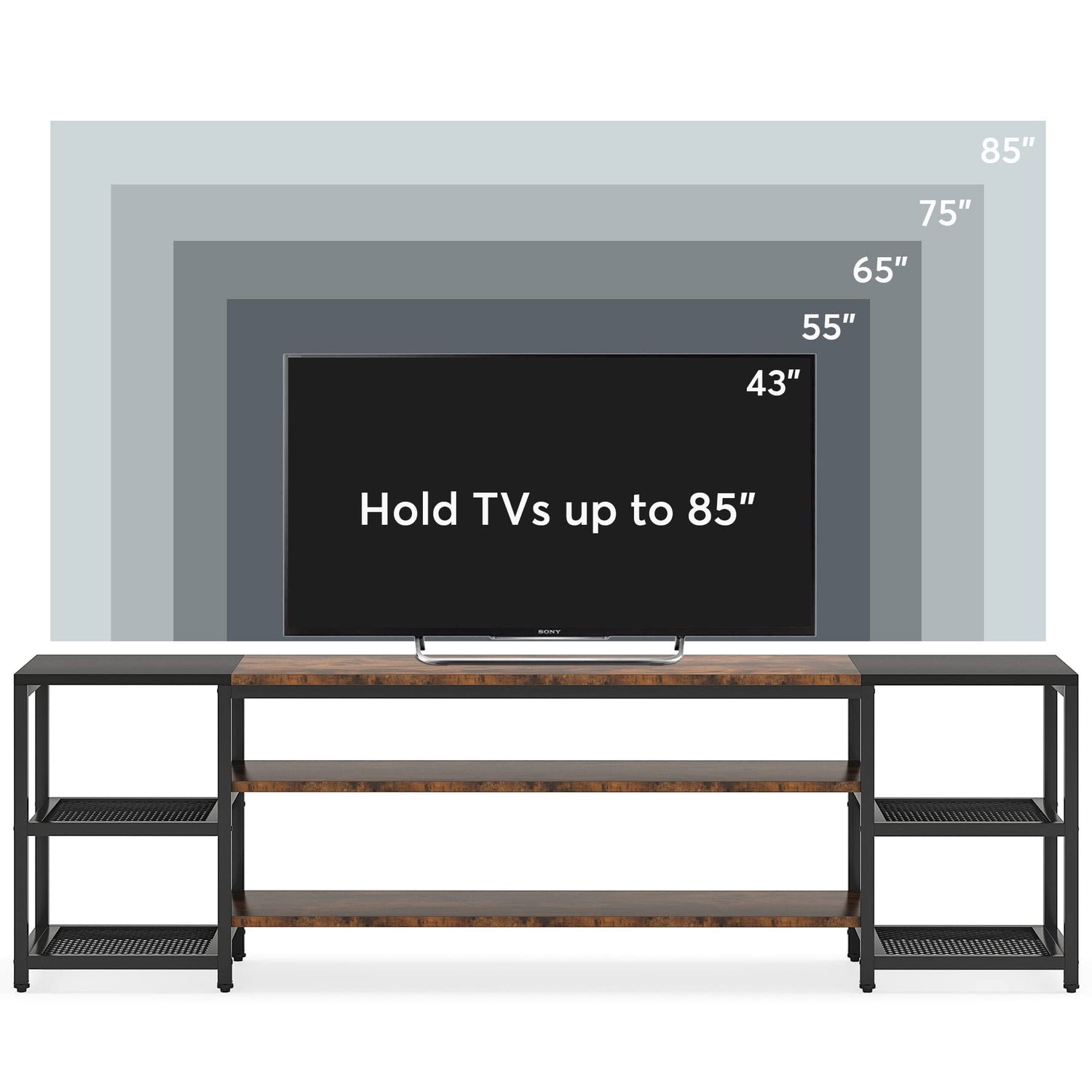 • [Ample Storage Space ] - The TV stand features an open display design including a 3-tier center compartment shelf and 2 side metal mesh shelves to provide easy storage and display of TV or other audio-video accessories, which brings a great way to upgrade a traditional space and make it classic and retro.