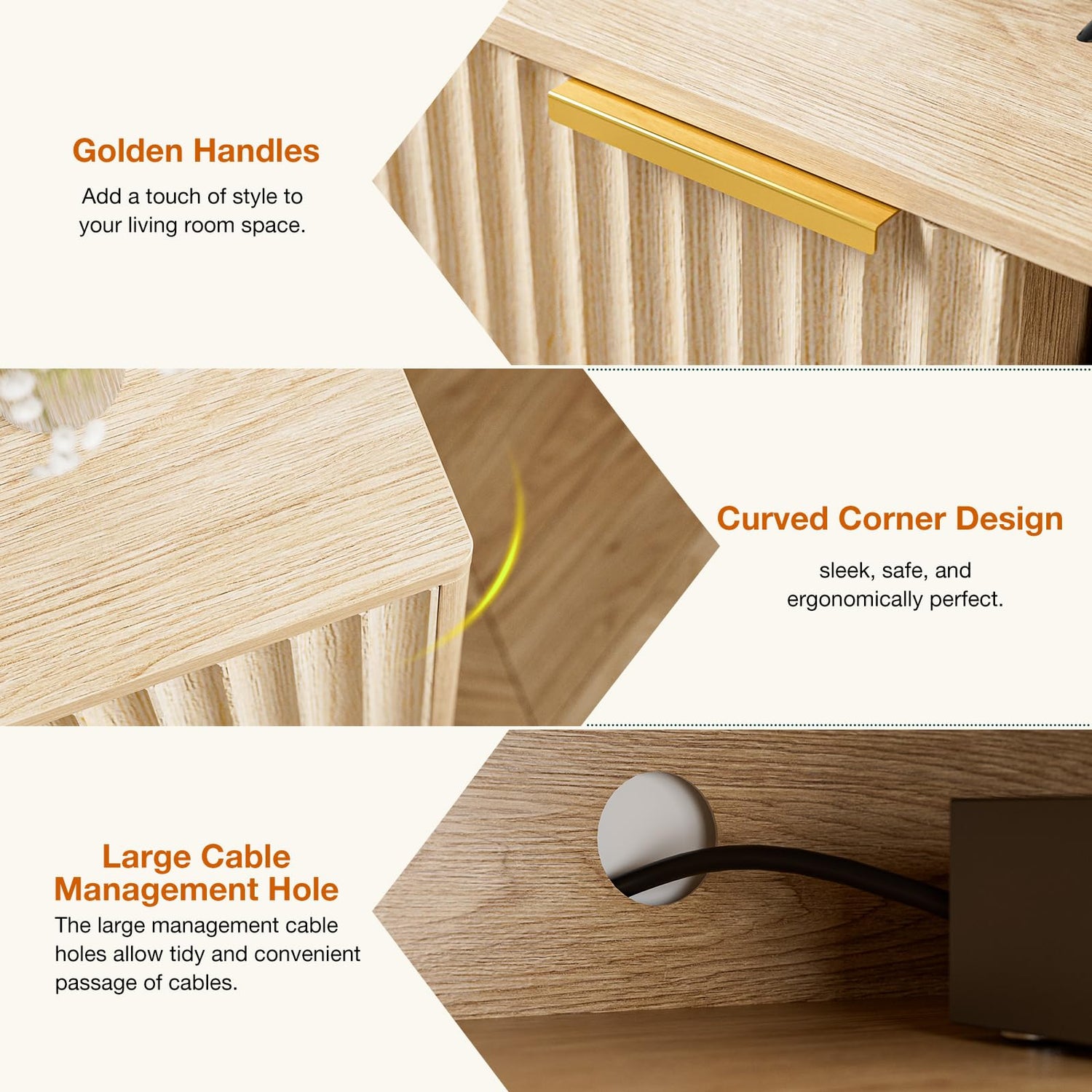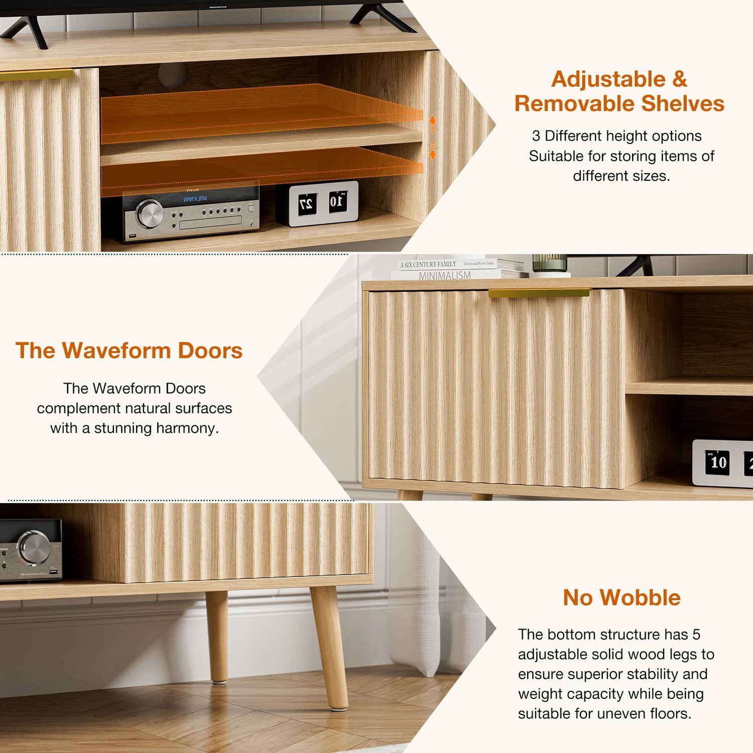 TV Stand for Living Room, Modern Entertainment Center for 55/60/65 inch TVs, Media Consol with Fluted Door Cabinets and Open Shelves, for Bedroom, Oak