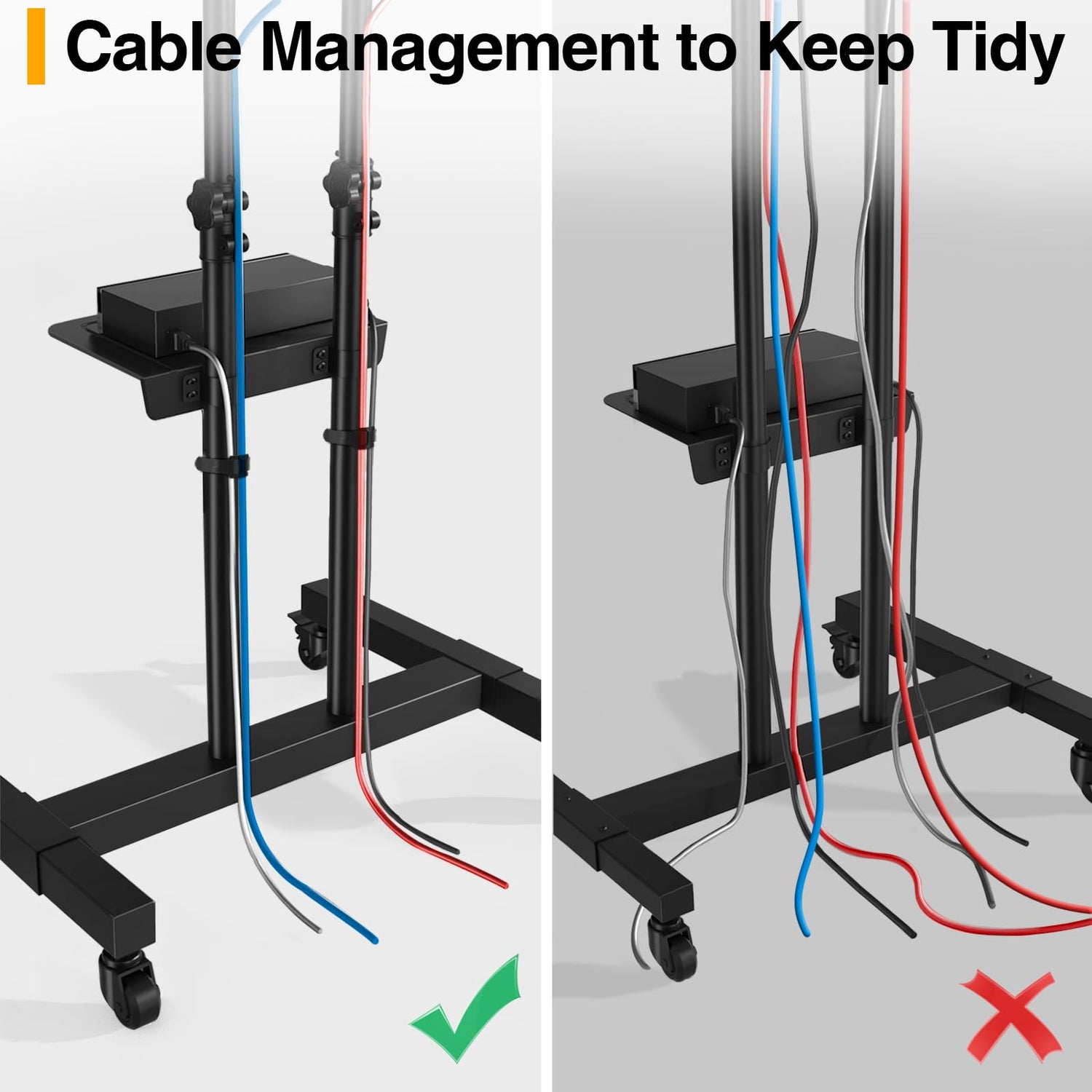 - 【Easy Assembly and Space Saving】- The mobile tv stand on wheels will be delivered in perfect condition, including all necessary parts, and individually packaged and labeled according to assembly instructions. It's just a matter of putting them all together. The base is a space-saving design that can be placed behind a TV cabinet/at the end of a bed/under a dresser/in a corner or simply against the wall.