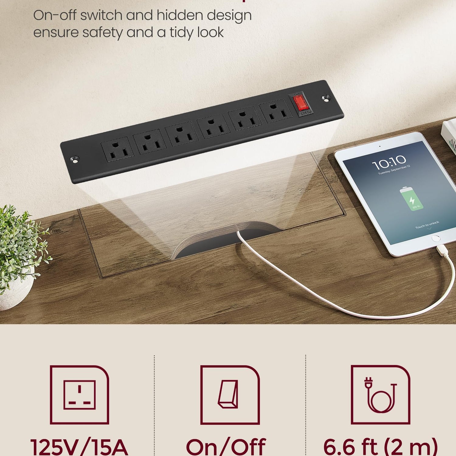 - [Built-In Charging Station] With 6 AC outlets, you can conveniently charge multiple devices at the same time. The on-off switch and overload protection provide added safety, while the hidden design helps maintain a tidy desktop