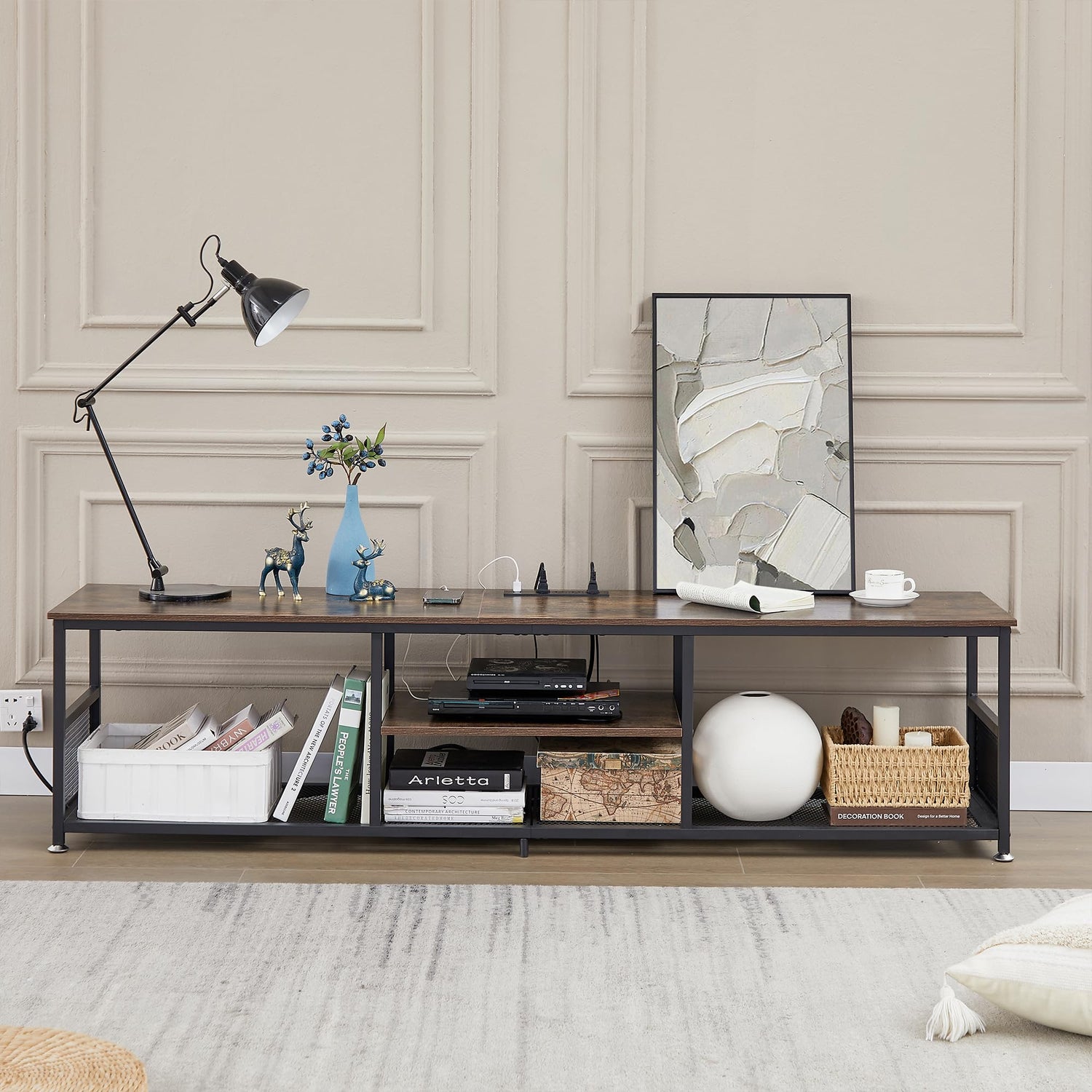 - 【 Sturdy and Stable TV Cabinet】 Vecelo TV stand constructed of quality particleboard shelves and industrial mesh shelves, top surface supports up to 200 lbs. and open shelves weight capacity is 65 lbs. The adjustable foot pad ensures it is more stable on an unbalanced floor.