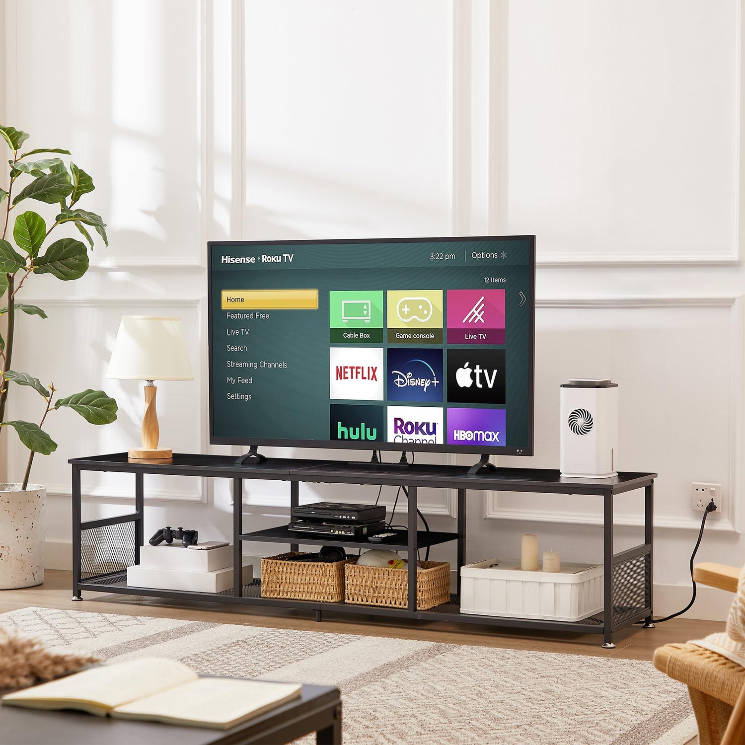 VECELO TV Stand with Power Outlets for Televisions up to 80Inch, 70" Media Entertainment Center with Charging Station 3-Tier Open Storage Shelves with Metal Frame for Living Room/Bedroom,Black