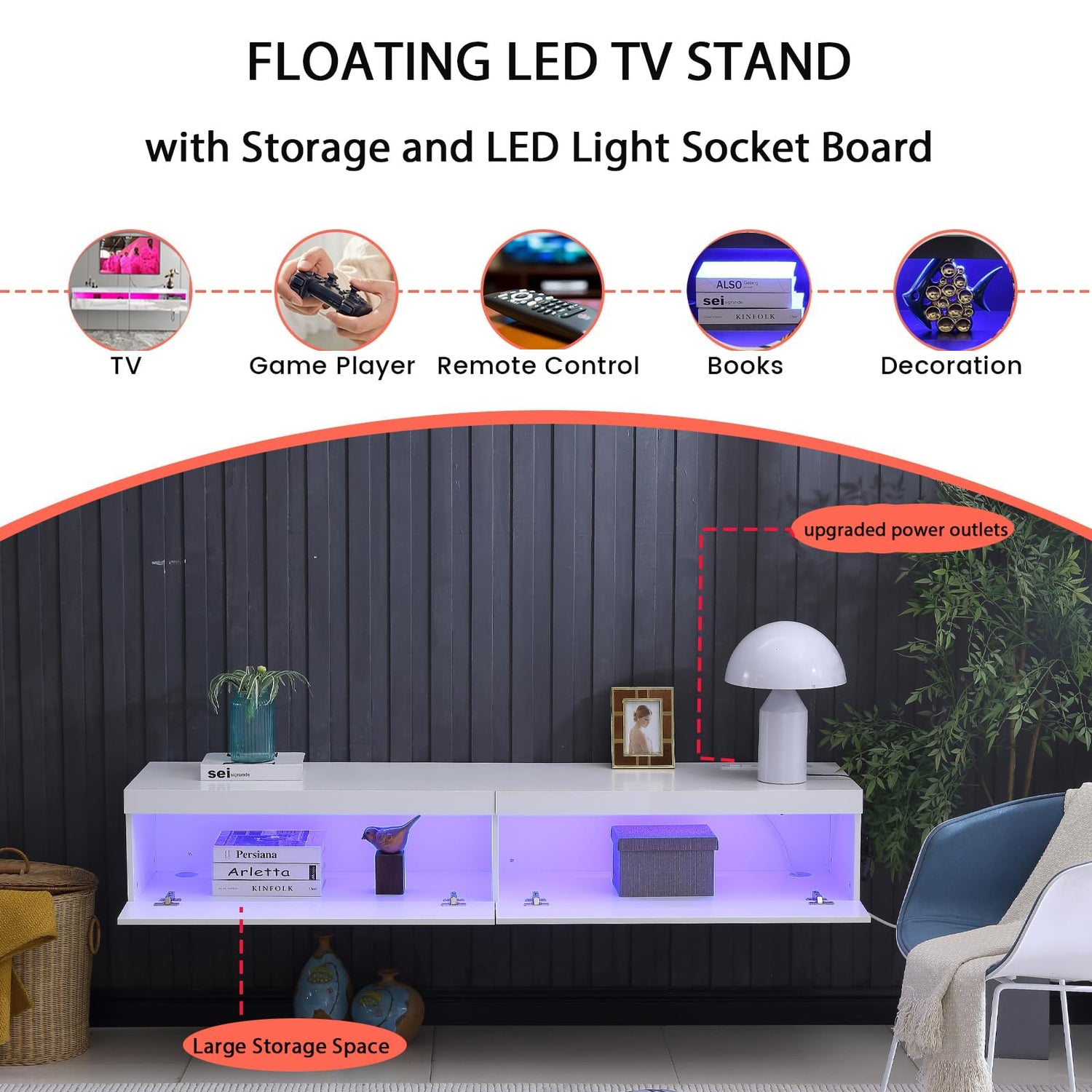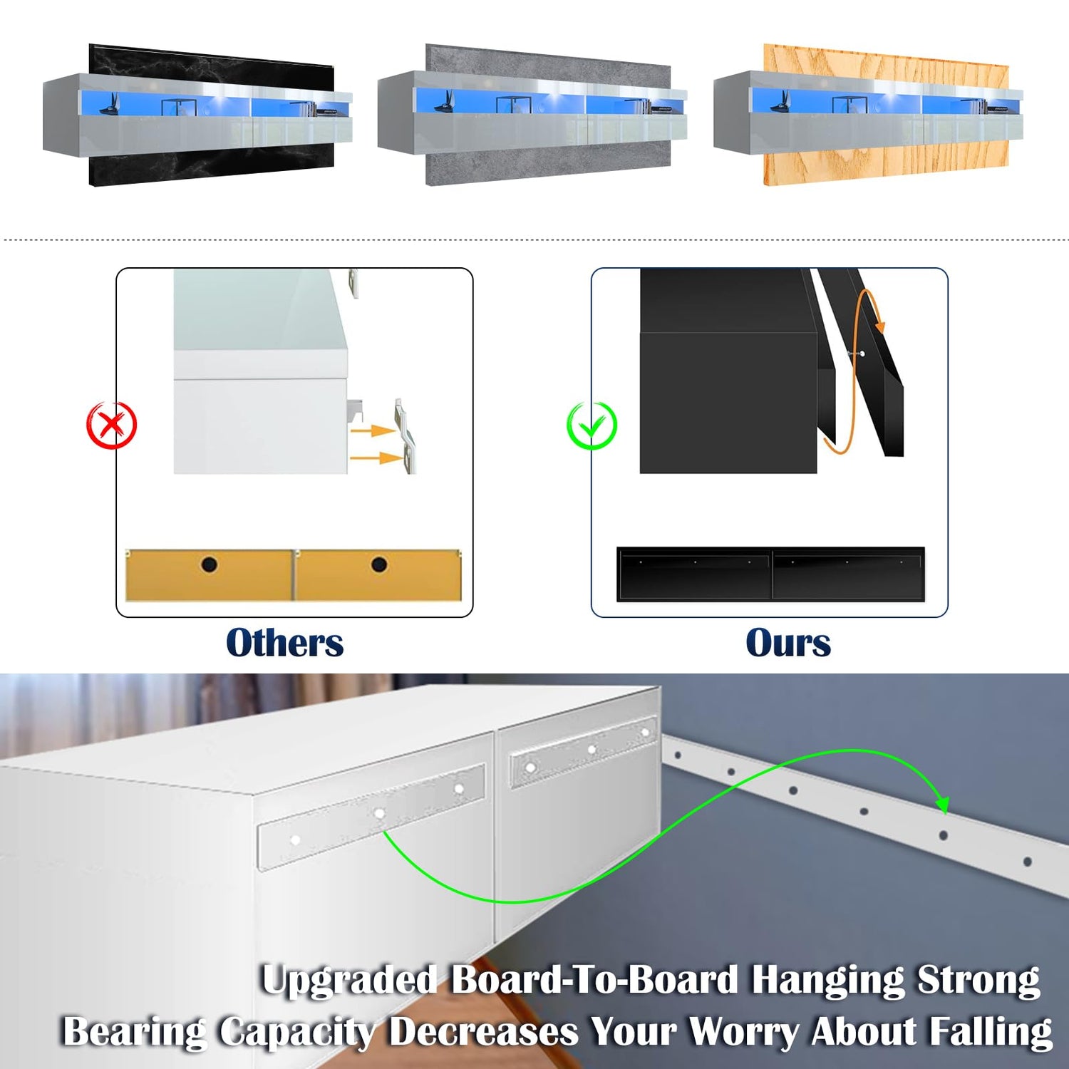 - Upgrade LED Lights and Power Outlets: The floating TV Stand is equipped with 16 colors adjustable led system. Inside features 2 standard plug outlets and 2 USB plug for which you can charge your TV, DVD, WiFi router and etc.In addition, mobile phone control lights don't worry about finding the remote control anymore.