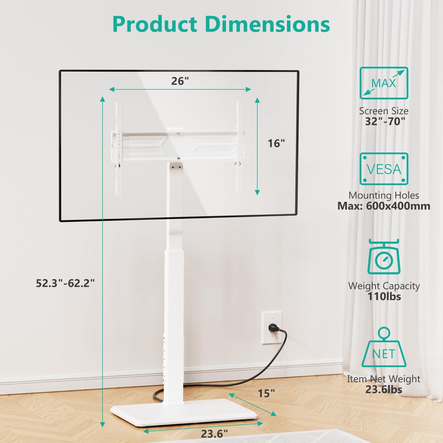 - 18 HEIGHT ADJUSTABLE-52.3in to 62.2in: The tall TV stand offers 3-position height adjustment for both the support bar and TV bracket, the VESA panel features a 2-position adjustment, providing flexibility to customize your viewing experience