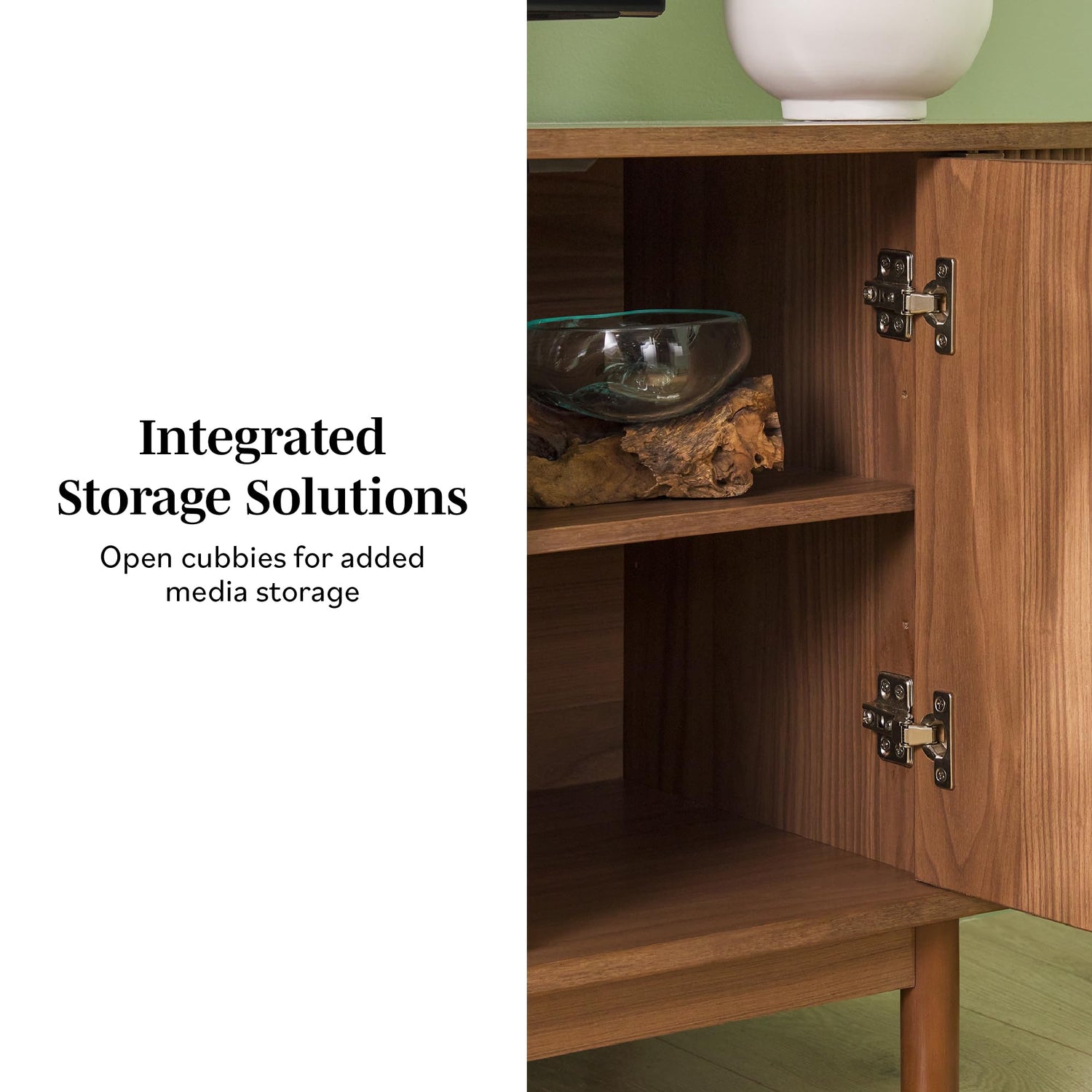 Details: Every movie night is made better with this modern reeded 60” TV stand made with style and versatility in mind. Reeded door fronts elevate the design, combining sleek looks and practical functionality. Luxurious touches like soft-close doors, durable MDF, and scratch-resistant laminate make your TV stand seem more expensive than it is (but your secret’s safe with us.) This design-inspired TV stand pairs well with any room, from clean, modern spaces to traditional-meets-modern aesthetics. You’ll love the combination of concealed cabinets and open cubbies, which offer spacious storage for media devices, books, and more. Easily fit a TV up to 65 inches, then start popping the popcorn, sit back, and enjoy!