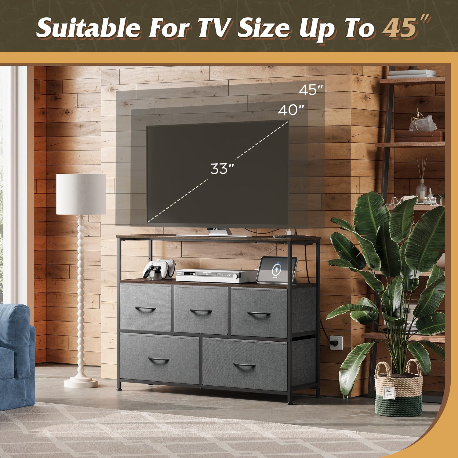 WLIVE 5 Drawer Dresser TV Stand for 45 Inch TV, Entertainment Center with Open Shelf and Power Outlet, Chest of Drawers for Bedroom, Living Room, Closet, Dark Grey
