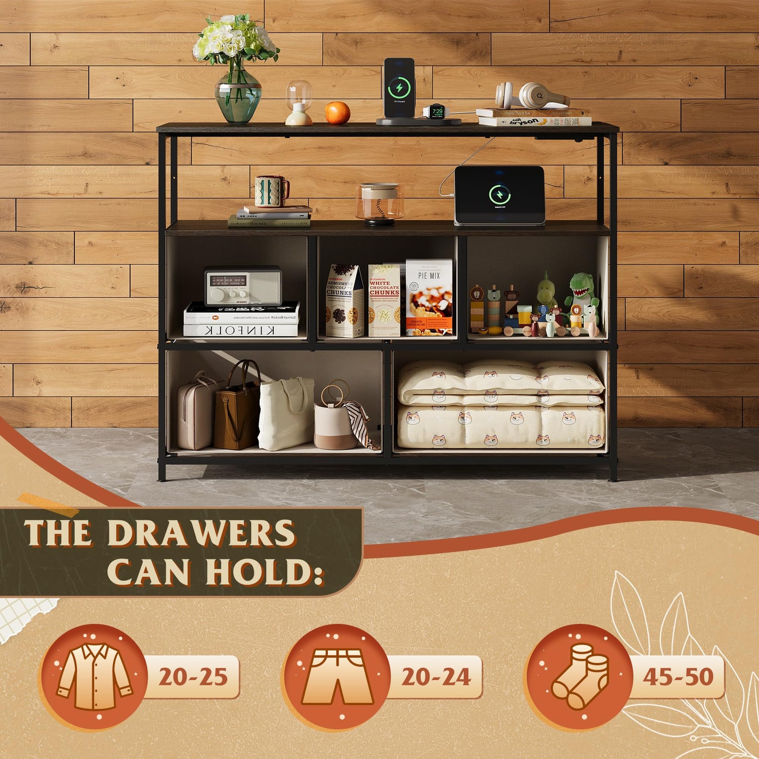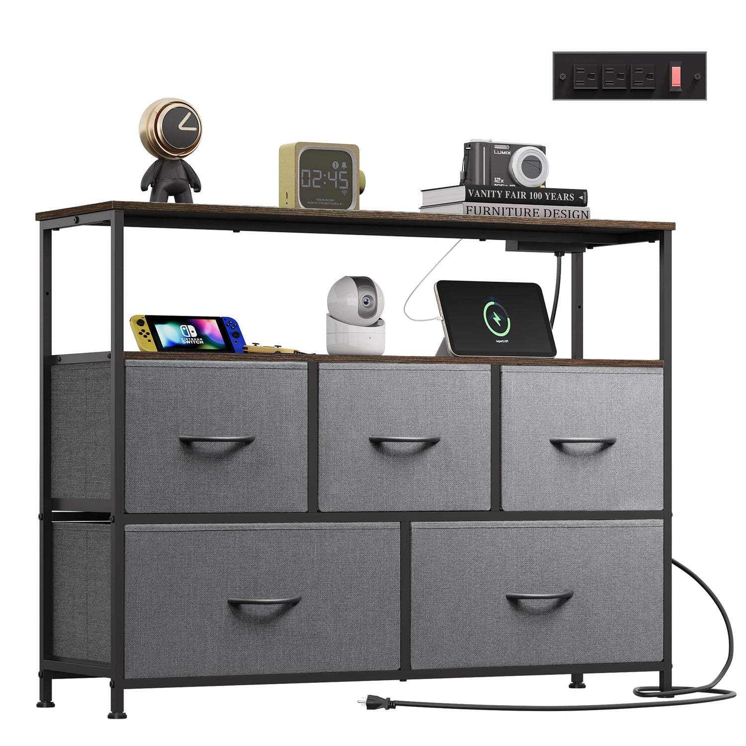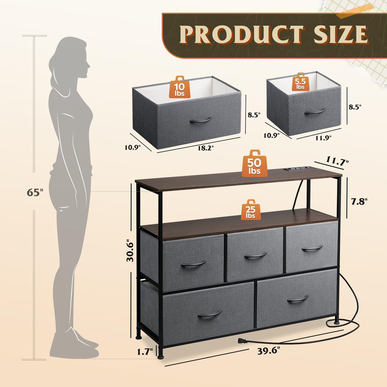 - 【✨ Powered Storage Dresser】Say goodbye to messy wires! The 5 Drawers Dresser is equipped with 3 AC sockets, 1.5m flexible cable length, TV, game console, router a power board can be done, instant increase desktop cleanliness by 50%, through UL/ETL certification, electricity safety!
