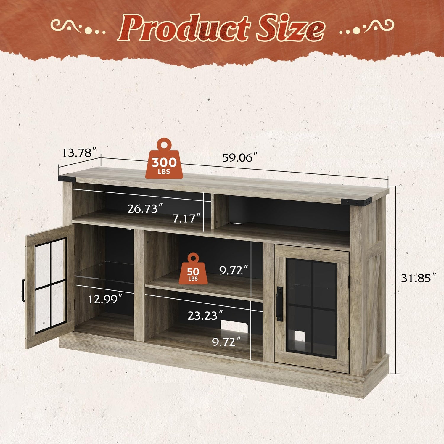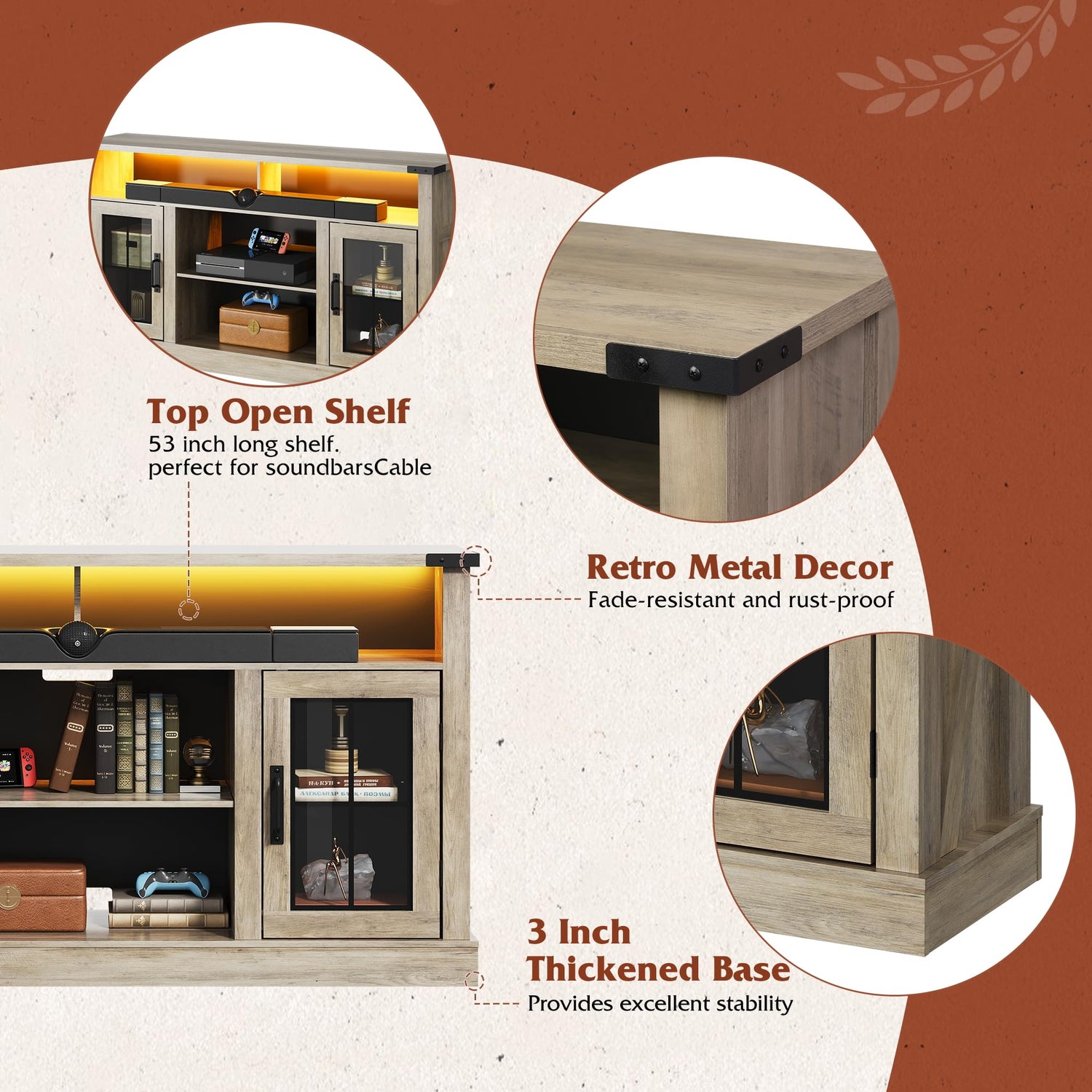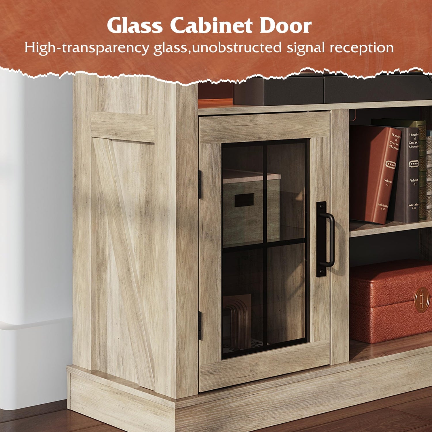 - 【Farmhouse Style TV Stand】Our Farmhouse Entertainment Center combines glass side doors, solid particle board, and a classic finish with metal accents at the corners, perfectly combining tradition with modernity for added character and durability. Antique metal accents resist fading and rusting, enhancing the beauty of your living room while showcasing superior craftsmanship