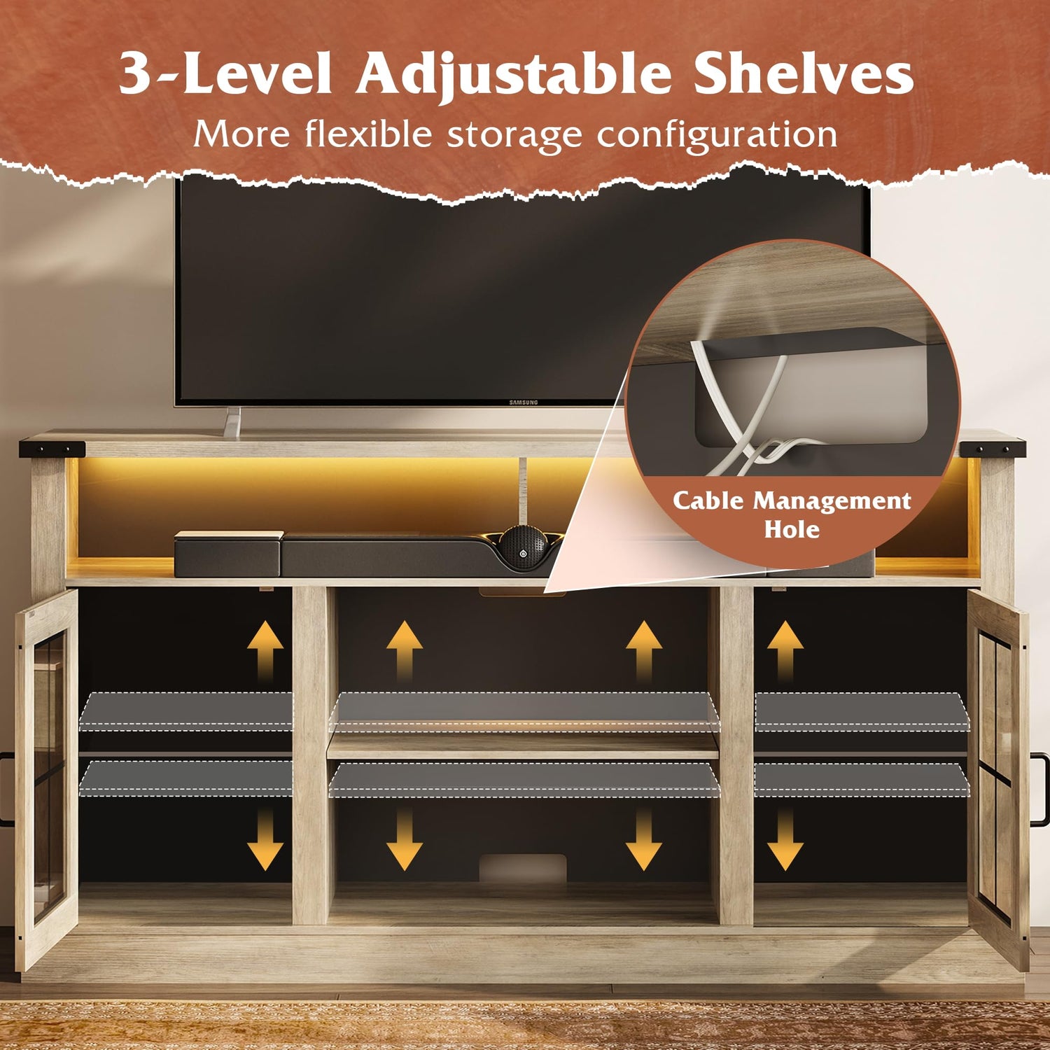 - 【Spacious Storage】This tall tv stand features an open top shelf and 2 storage cabinets with glass doors, along with adjustable shelves to beautifully display your favorite decor or collectibles while easily organizing your sound bar, DVDs, or gaming equipment. Six rear cable management holes keep your cords tidy and hidden.The spacious desktop is suitable for TVs up to 65 inches and other daily necessities