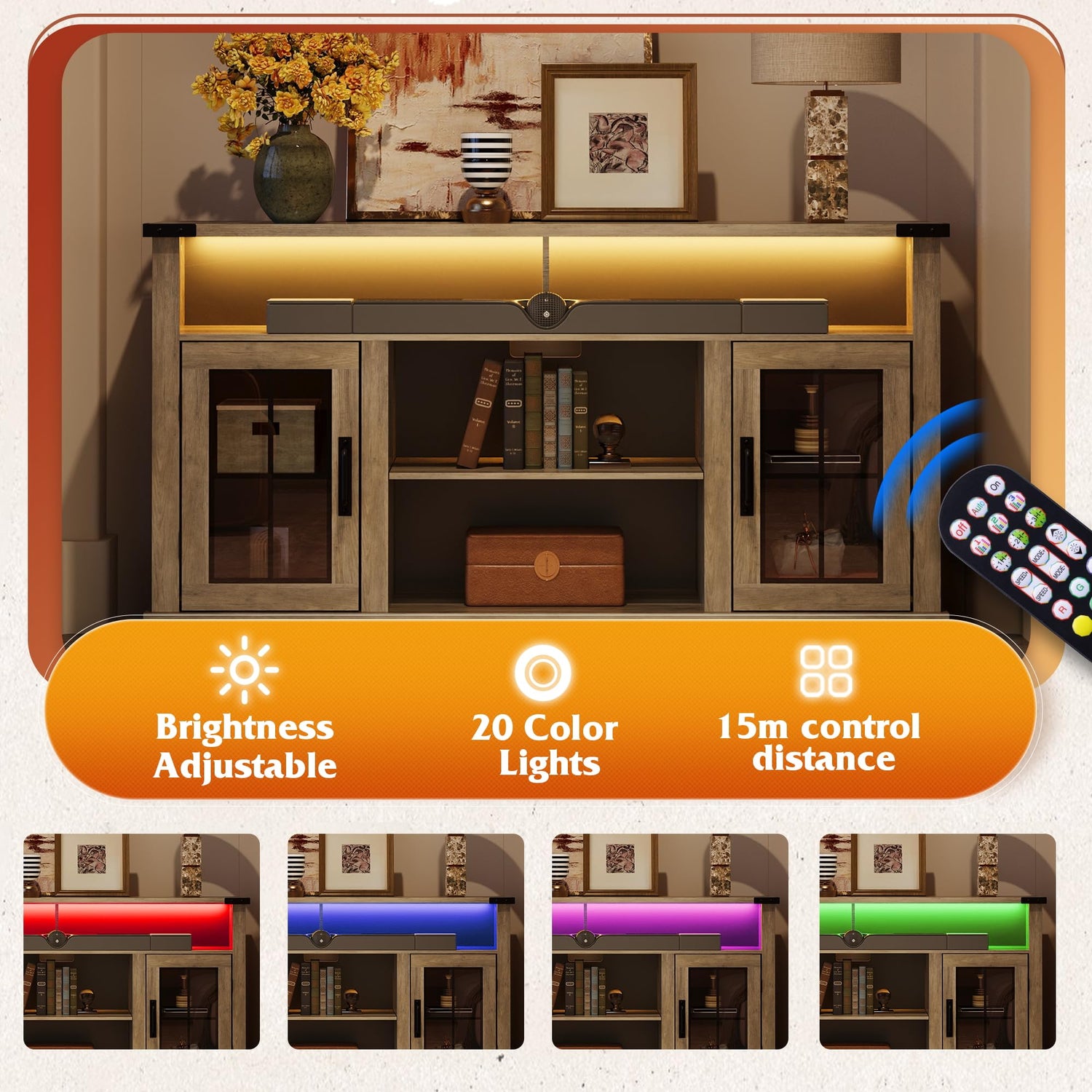 - 【Customizable LED Mood Lighting】Equipped with 3 LED light strips, it can be mounted on side cabinets and central open spaces. With 20 vibrant colors and multiple dynamic flashing modes, coupled with 5 brightness levels, you can fully immerse yourself in our LED media console, whether it's a cozy movie night or an intense gaming session, adding a touch of excitement and entertainment to your viewing experience