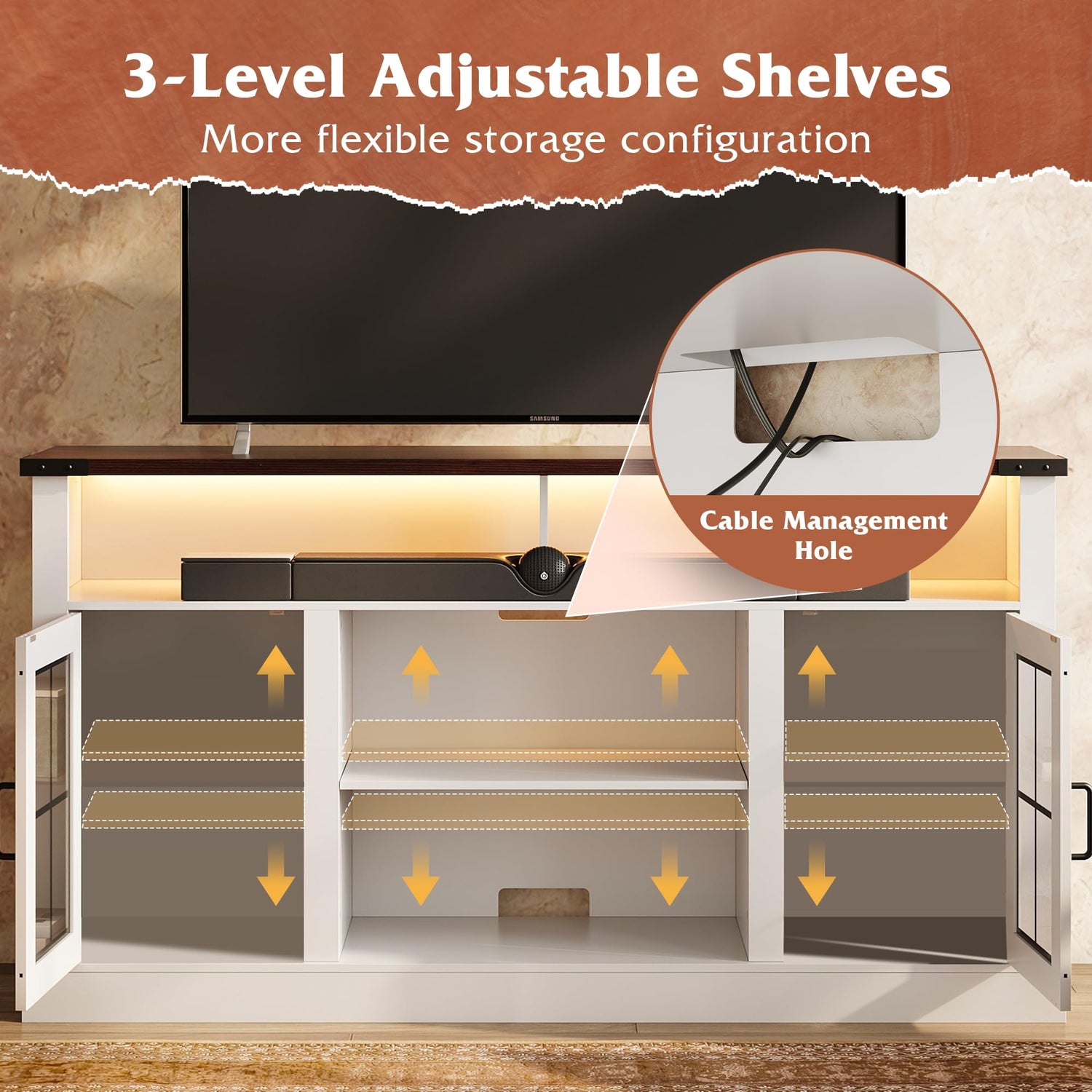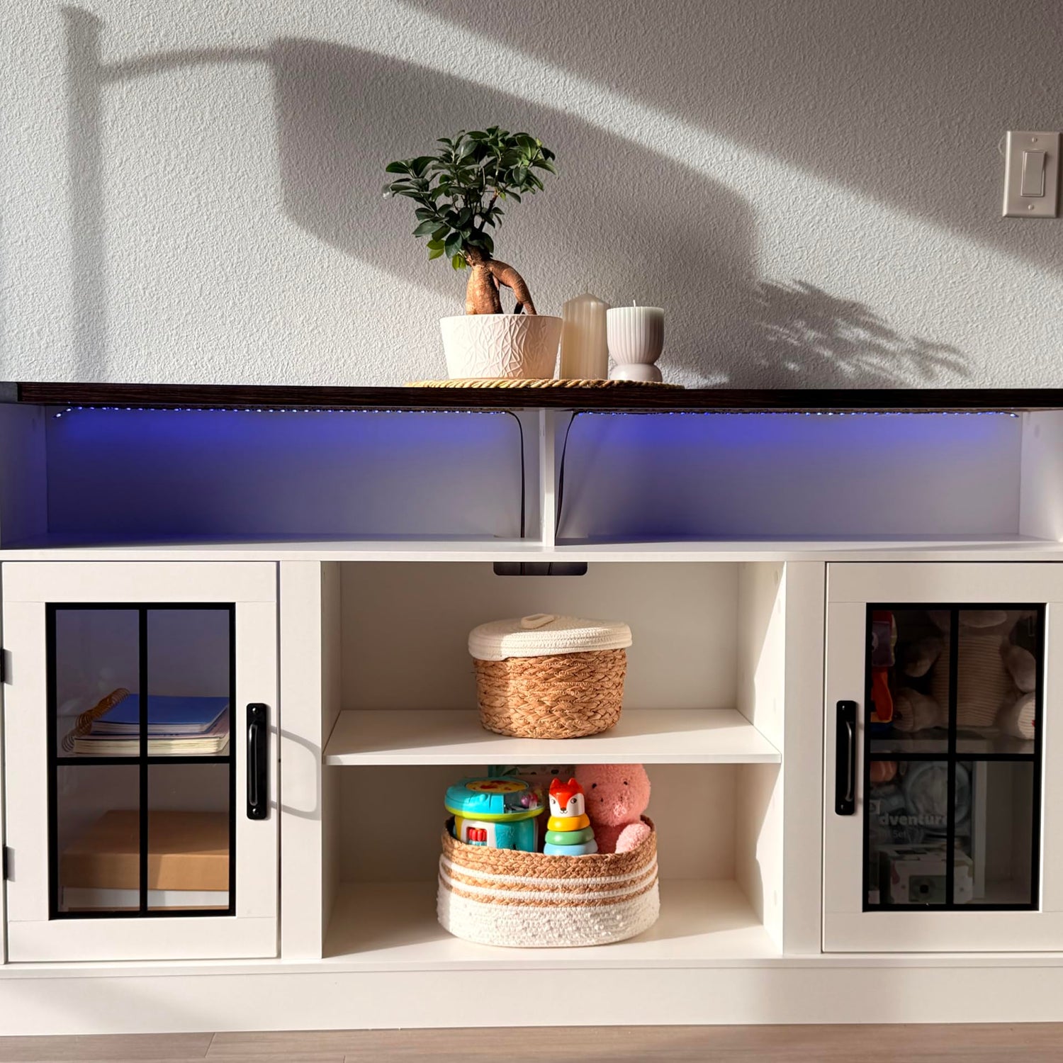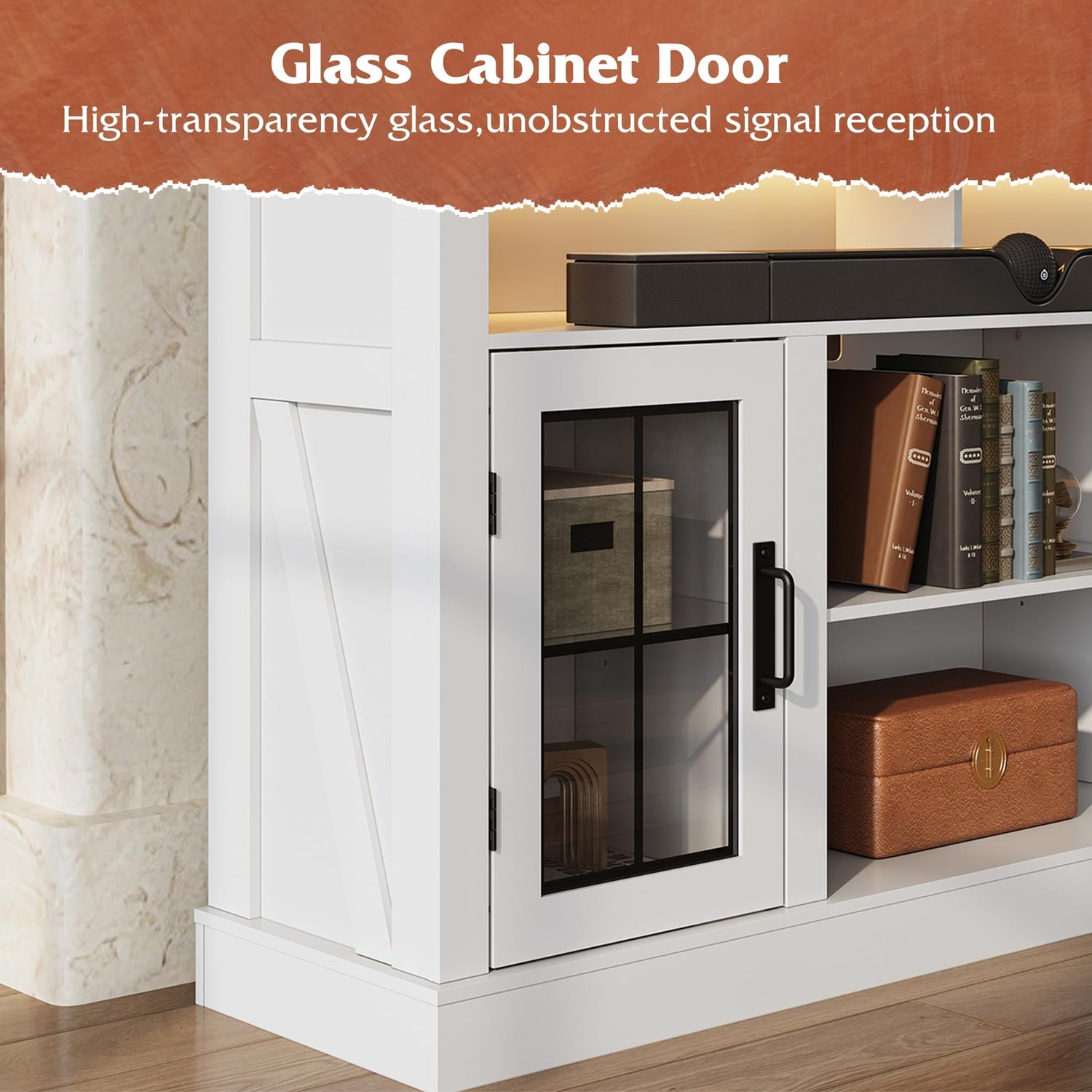 WLIVE Farmhouse TV Stand for 65 Inch TV, Tall Entertainment Center with LED Lights, Mid Century Modern TV Console wirh Open Shelves and Glass Cabinet Doors for Living Room and Bedroom, White