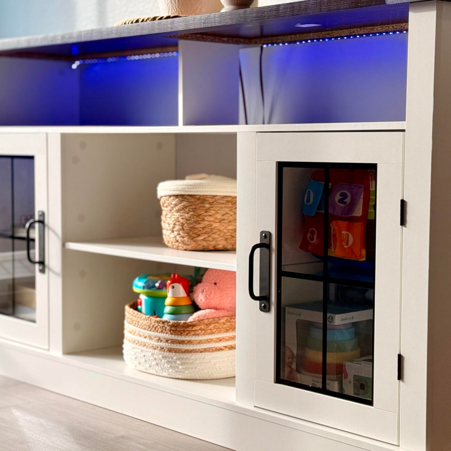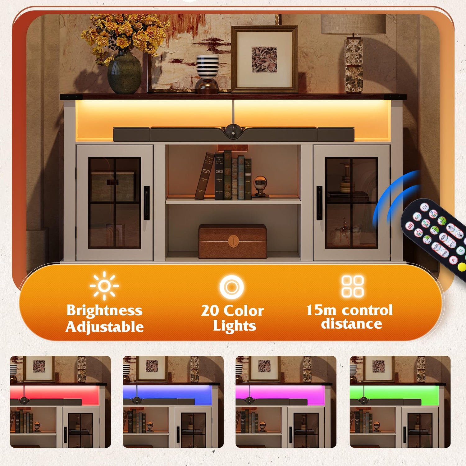 - 【Customizable LED Mood Lighting】Equipped with 3 LED light strips, it can be mounted on side cabinets and central open spaces. With 20 vibrant colors and multiple dynamic flashing modes, coupled with 5 brightness levels, you can fully immerse yourself in our LED media console, whether it's a cozy movie night or an intense gaming session, adding a touch of excitement and entertainment to your viewing experience