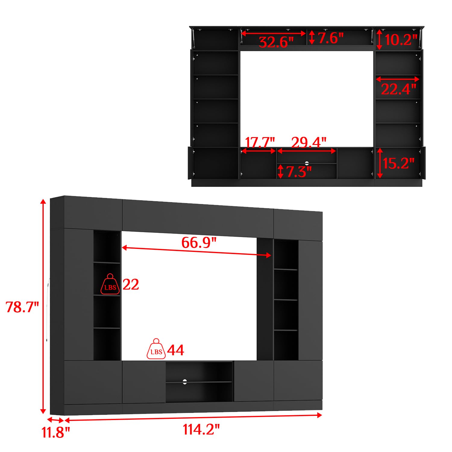 - [Package Contents & Dimensions] - Overall sizes: 114"W x 11.8"D x 78.7"H, sizes of the TV console: 66.6"W x 11.8"D x 19.5"H, wall mounted top shelf: 66.6"W x 11.8"D x 11.7"H, tall bookshelf: 23.5"W x 11.8"D x 78.7"H. This wall unit will come in 2 boxes and may not arrive at the same time, the hardware and the manual are in one of the boxes.