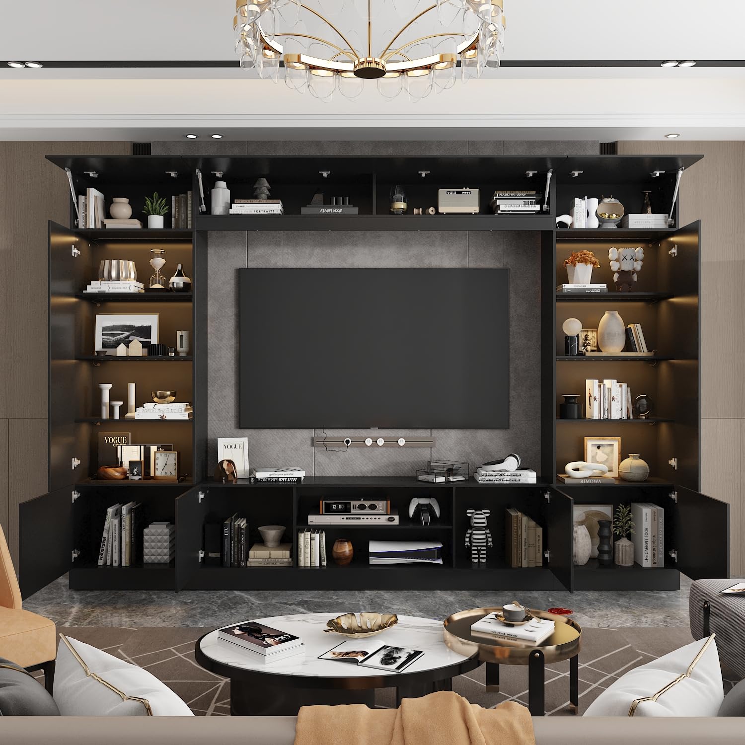 - [TV Stand with Lights] - Maximize the use of this multifunctional entertainment center wall unit, it combines a TV console, bookshelf, wine cabinet and display cabinet into one. The LED light strips are switch control, the lights are warm white. With the lights, the half cover doors help to display your collections sparkling. Cable holes are designed to organize the various wires in an orderly way.