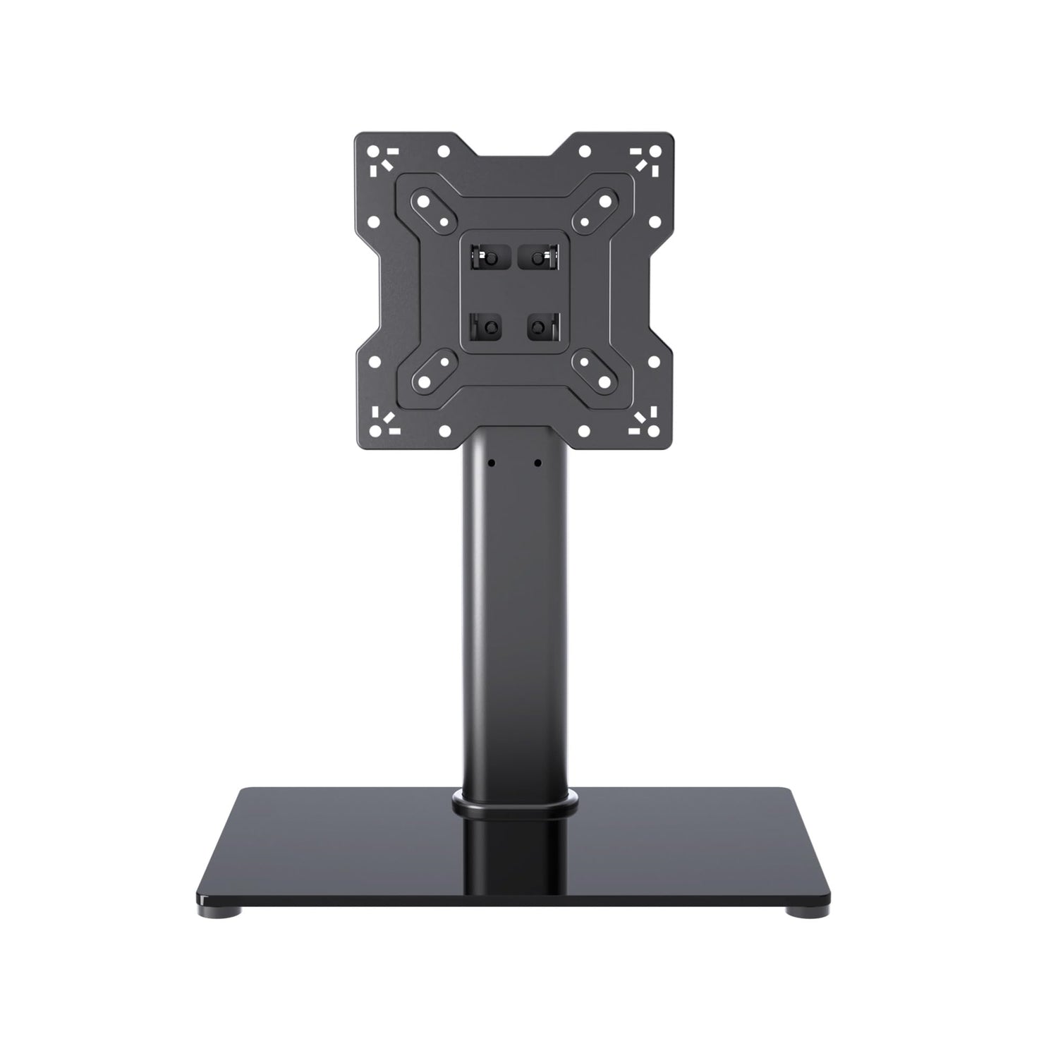 - STABLE:This TV stand with mount is constructed with heavy duty tempered glass, base size:10.24x15.75”, net weight:9.4lbs. There are also 4 non-slip foam feet to increase friction.
