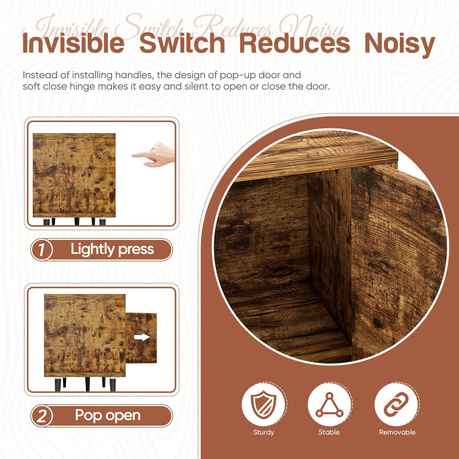 • Pop-up Door: The TV stand adopts pop-up doors instead of handles, so that it looks very neat. And there are soft close hinges behind the door, which makes it silent and safe for hand to close.