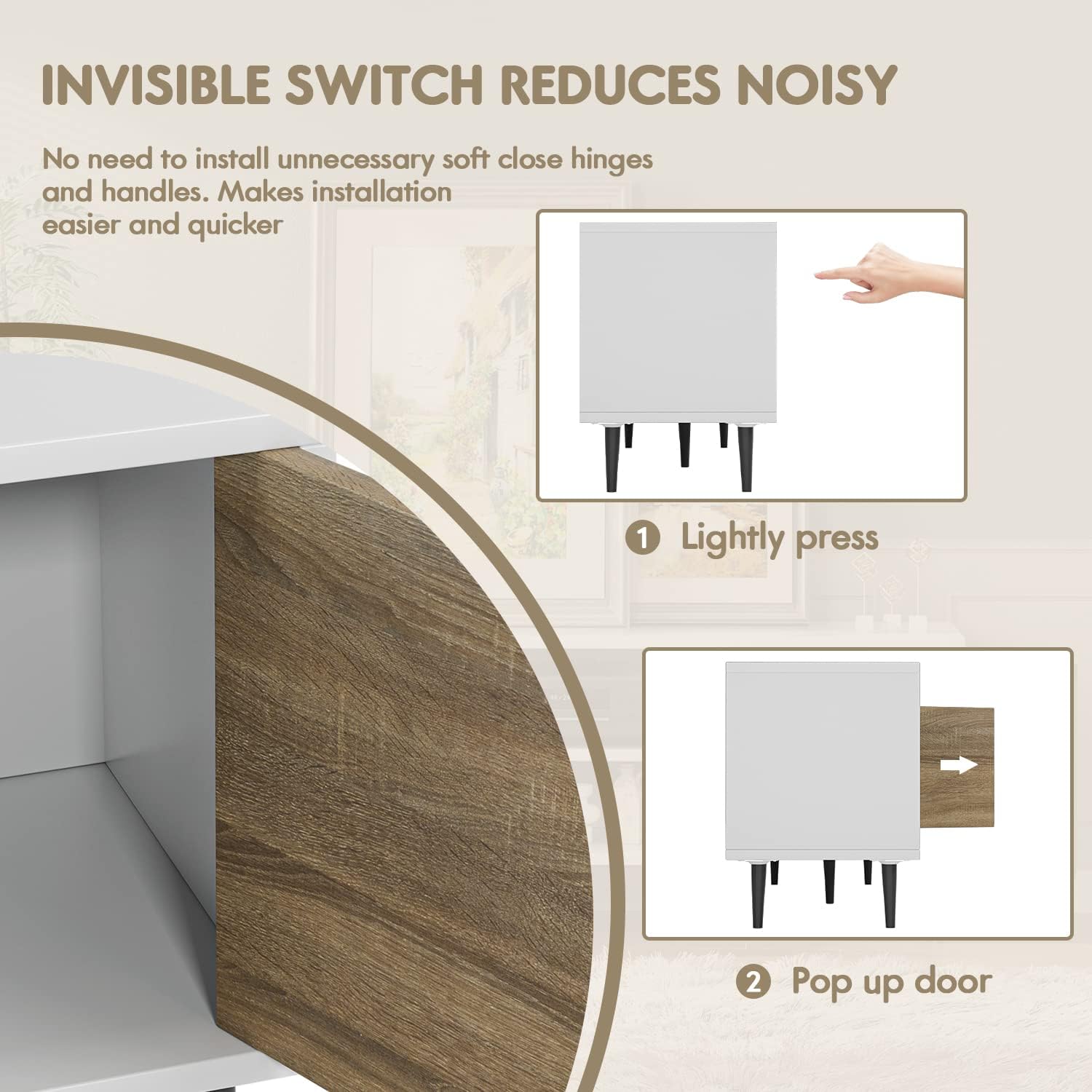 - Pop-up Door: The TV stand adopts pop-up doors instead of handles, so that it looks very neat. And there are soft close hinges behind the door, which makes it silent and safe for hand to close.