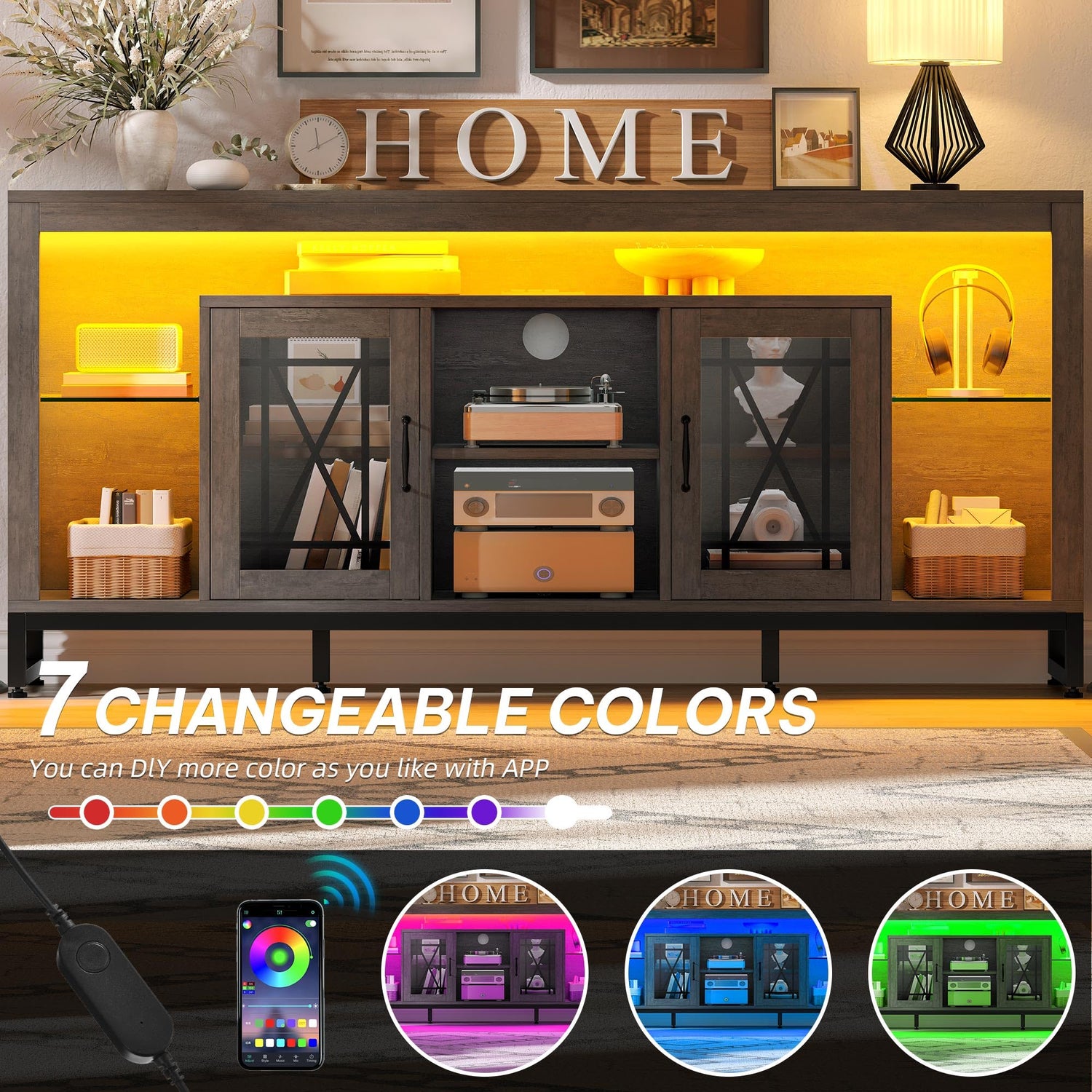 • Dynamic LED Lighting: Brighten your living room with our TV stand's multi-color LED lighting, controlled by remote or app. It's designed to enhance your movie nights and gaming experiences with the ideal lighting ambiance