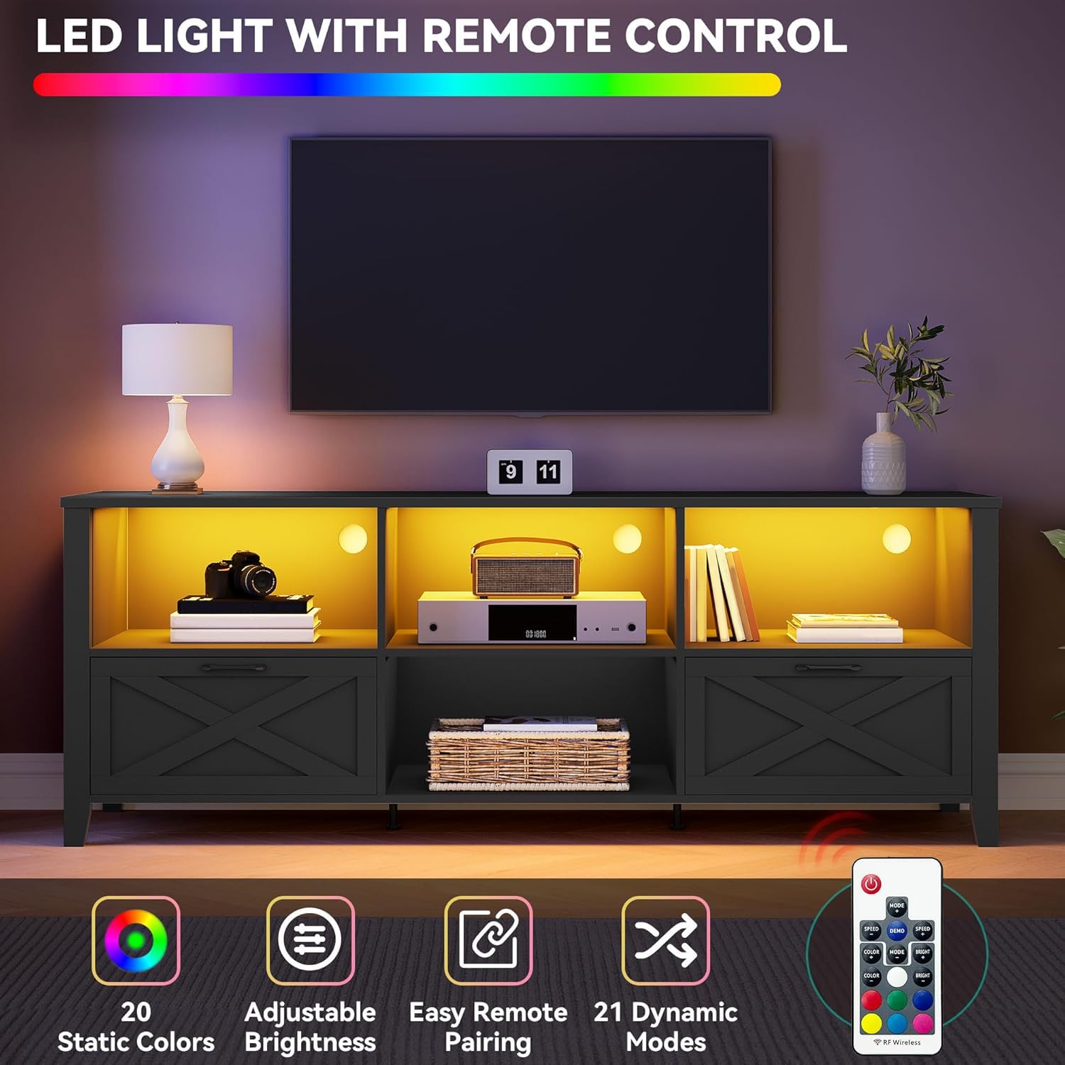 - LED-Lit Accent: Infusing elegance and sophistication into your interior design, our entertainment center comes with RGB LED light strip that can be controlled with a remote for an ideal ambiance
