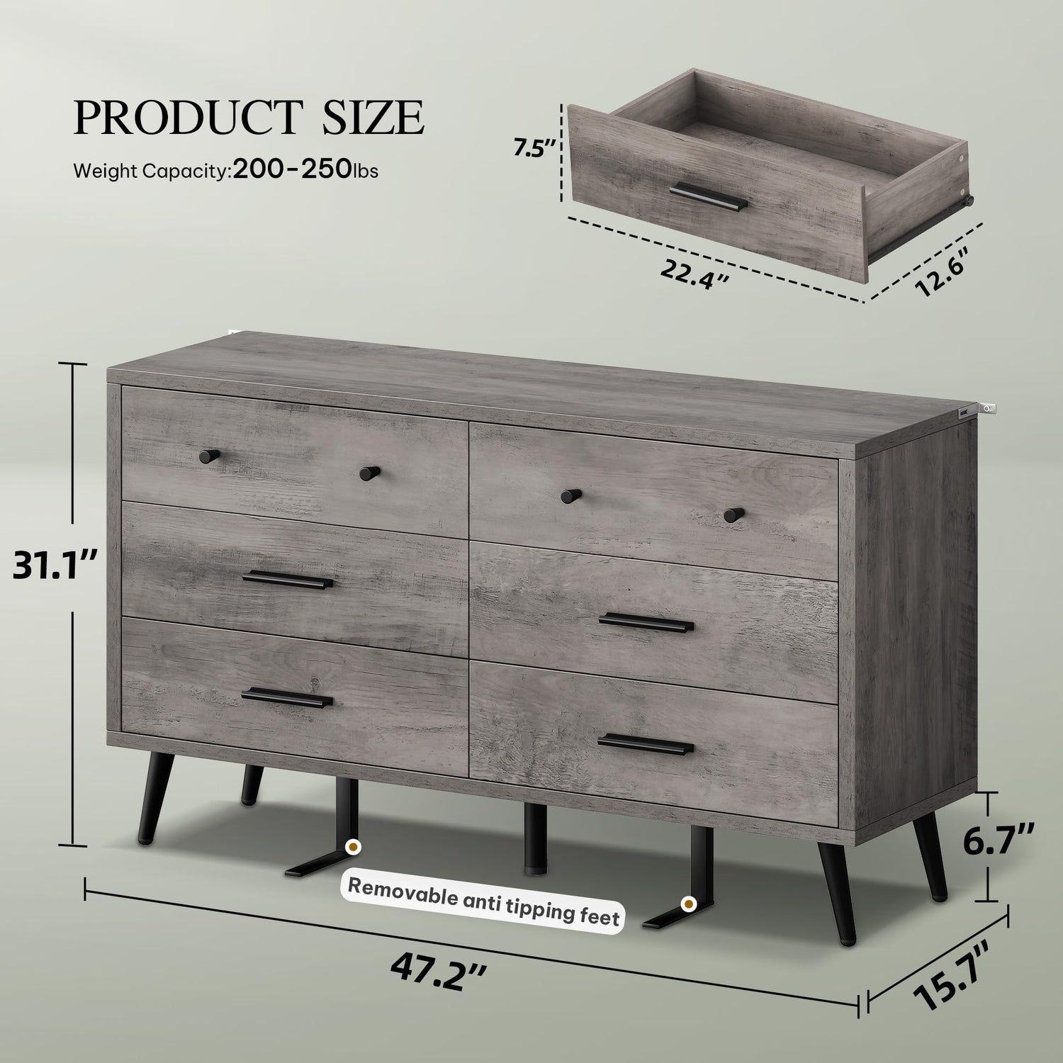 YITAHOME Grey Dresser TV Stand for 55 Inch TV/6 Drawer Dresser Entertainment Center/Console Table with Black Metal Handles & Anti-Tipping Device for Living Room/Bedroom