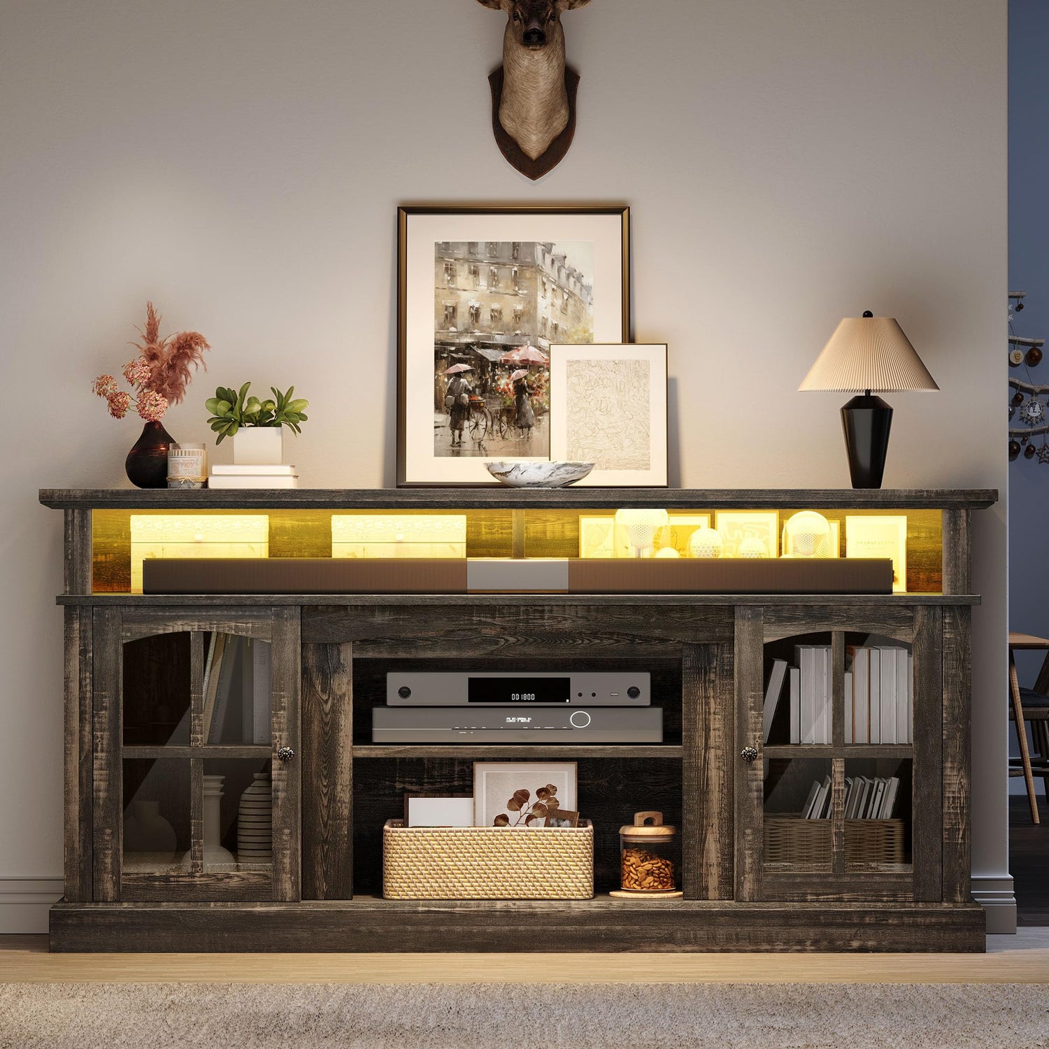 YITAHOME LED Farmhouse TV Stand for 75 Inch w/Outlets, Modern Entertainment Center with Glass Doors and Adjustable Storage Shelves, Media Console TV Cabinet for for Living Room, Dark Rustic Oak