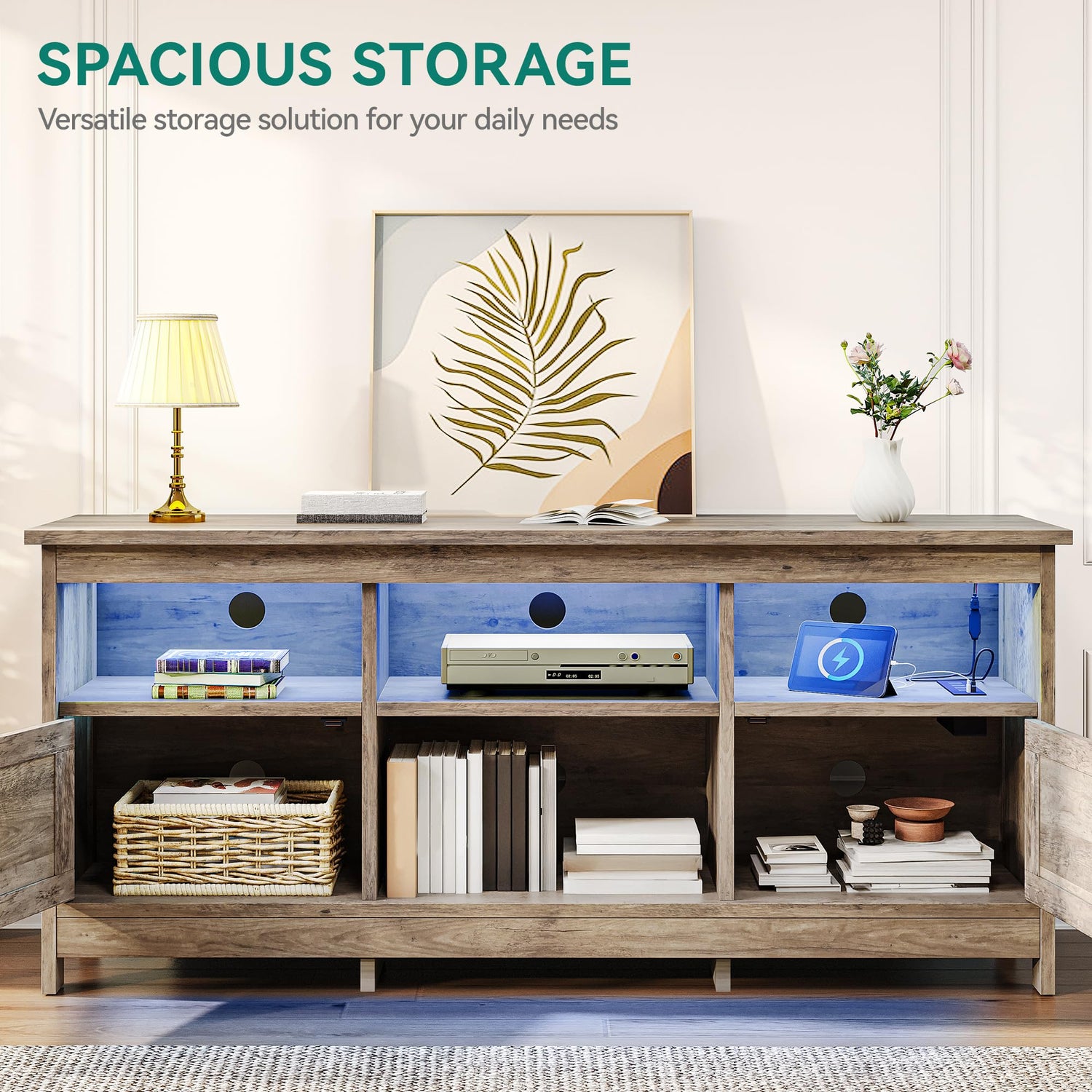 - FLEXIBLE STORAGE SOLUTIONS: This TV stand features a customizable storage layout with movable shelves to accommodate items of varying heights; 4 open spaces and 2 storage cabinets provide ample storage space