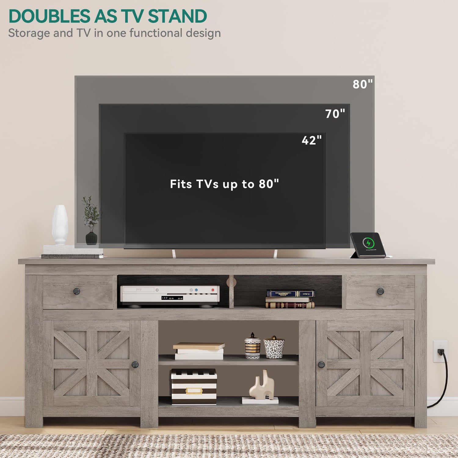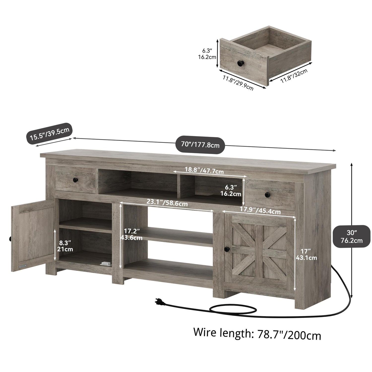 Details: This TV stand embodies a harmonious fusion of classic farmhouse allure and contemporary practicality. Boasting dimensions of 70 inches in length, 15.5 inches in width, and 30 inches in height, it can comfortably accommodate televisions up to 80 inches in size. Equipped with 2 spacious cabinets, 3 adjustable shelves, and 2 convenient drawers, this stand offers ample storage solutions to keep your living room organized and clutter-free. The built-in power outlet serves as a practical charging station, allowing you to easily power up your devices without the need for additional cords or adapters.