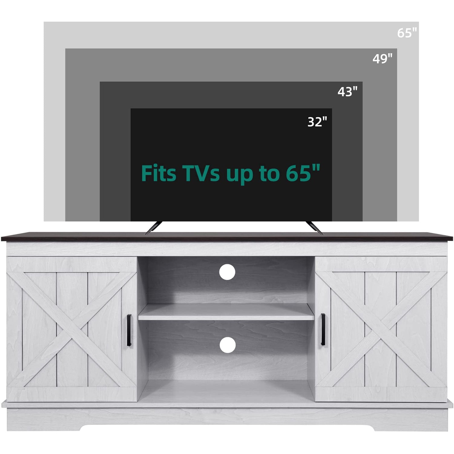 - Sturdy and Durable: The farmhouse TV stand is made from well-done engineered wood with unique and exquisite wood grain. This TV stand fits 50/ 55/ 60/ 65 inch TV. Dimensions: 15.7"D x 59.5"W x 26"H