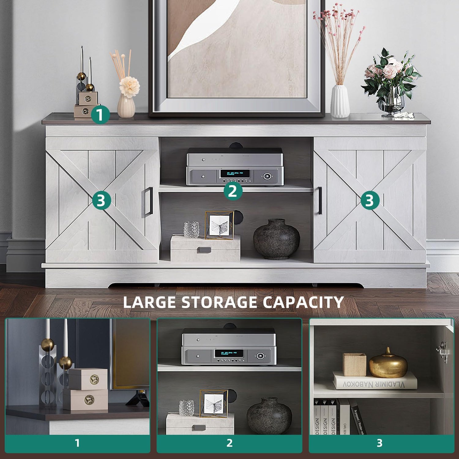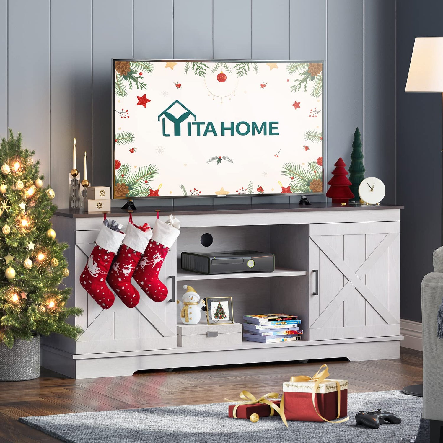 - X-Barn Doors & Unique Color: The double barn doors with X elements, elegant grey white and noble espresso color mixing make YITAHOME TV stand a piece of farmhouse & decorative furniture or a storage cabinet in your kitchen, easily blending with other room decor. Ideal for cottage, modern or industrial-inspired home settings