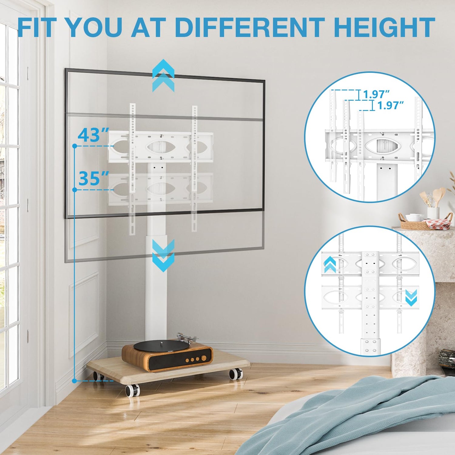 YOMT Floor TV Stand with Mount for 32-70 Inch Flat Screen/Curved TVs, Swivel Rolling Height Adjustable Portable TV Stand on Wheels, Modern Mobile Wood Base White TV Stand for Bedroom Home Office