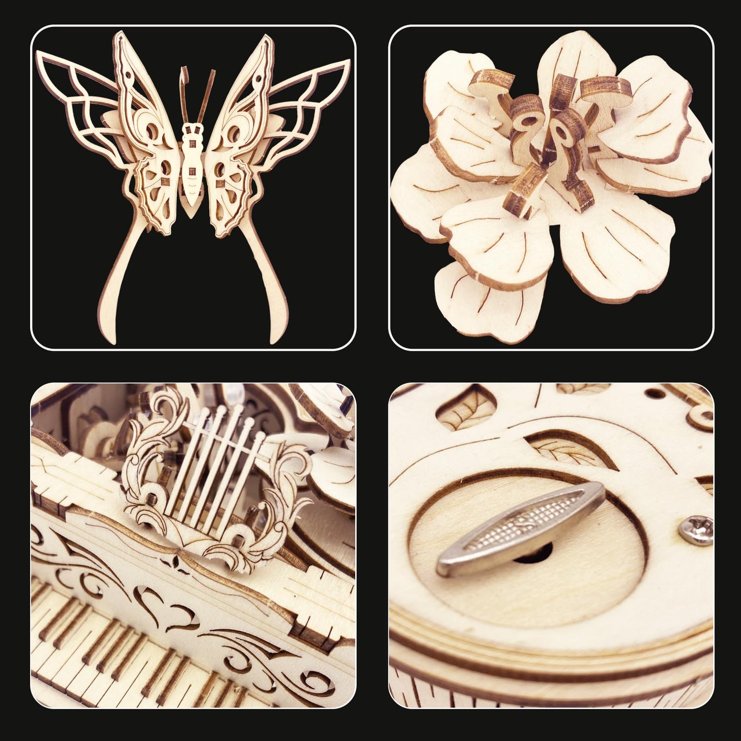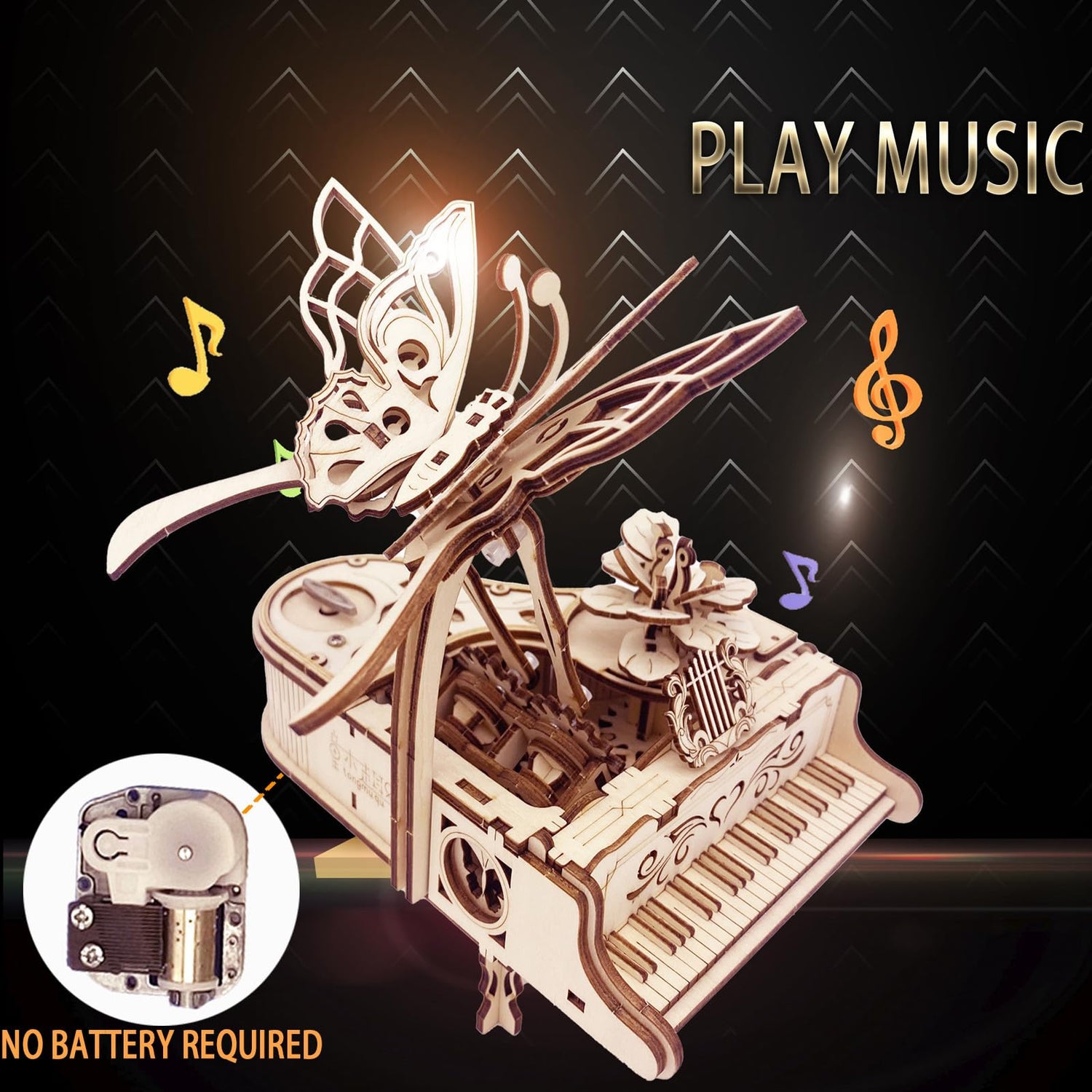 - PERFECT DESIGNED: build your own manual music box, Assembling this wooden 3D toy is the perfect way to release stress!The design of this educational toy is inspired by the piano, when you finish assembling and start it, The butterfly above the piano swings to the music, you will let be attracted by the magical scene.