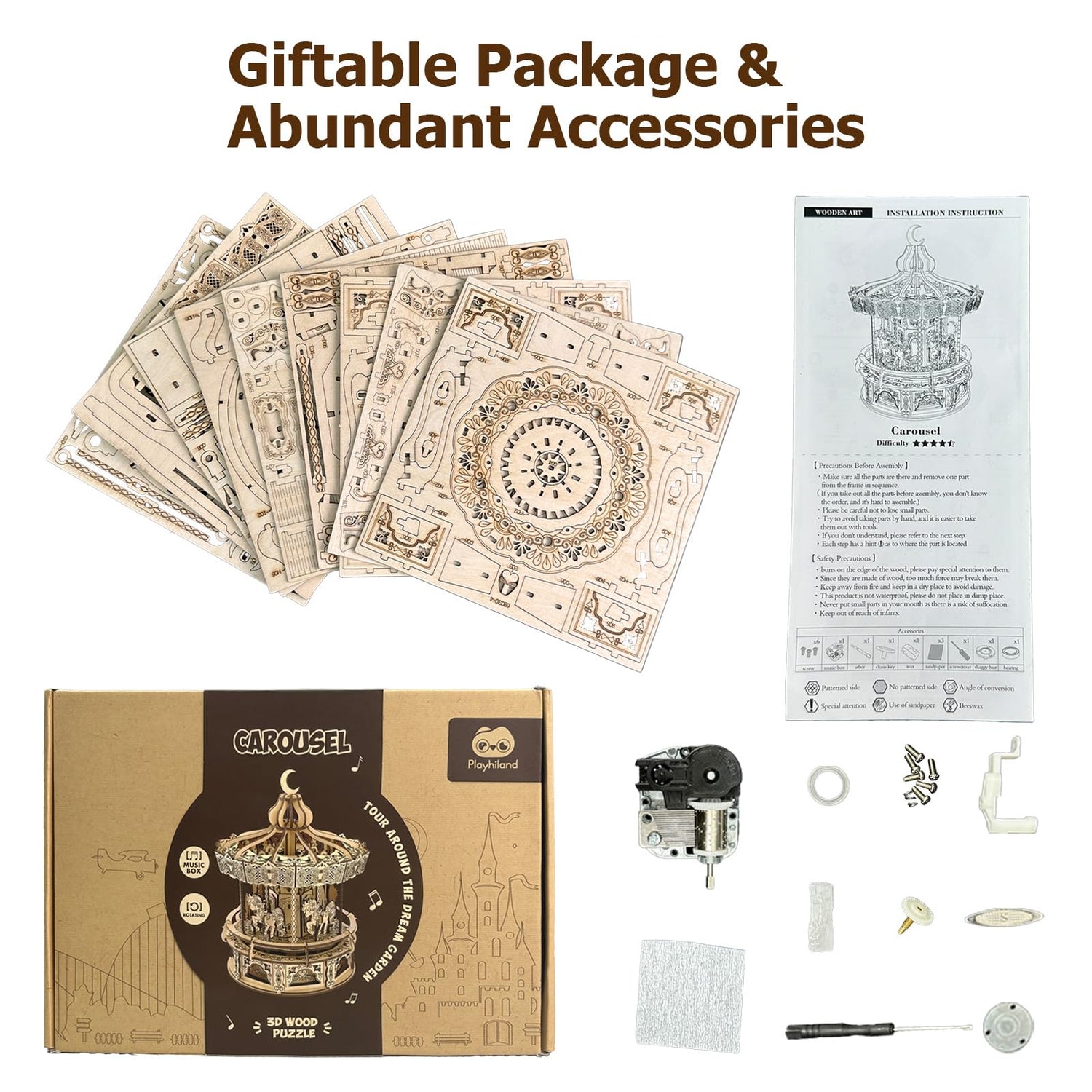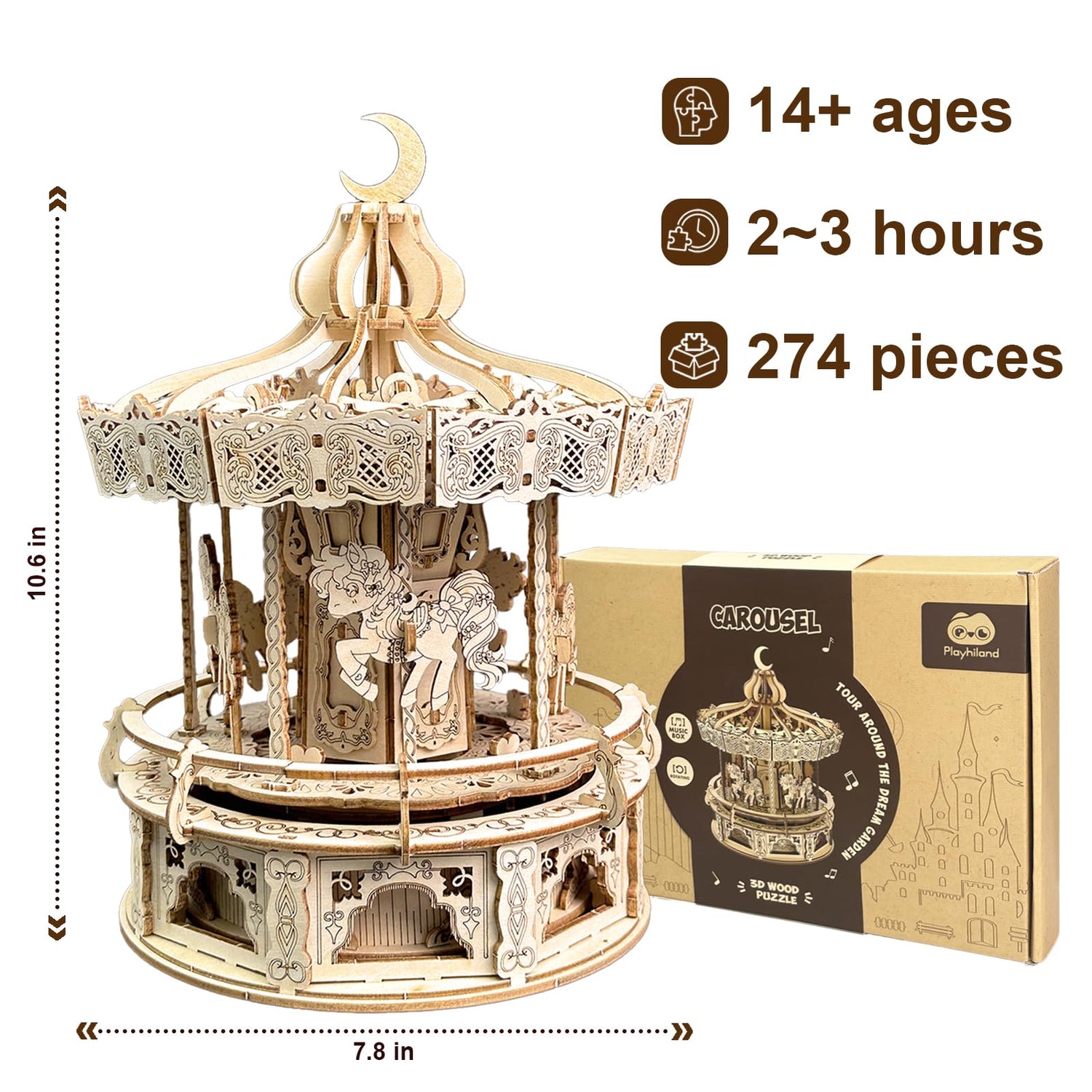 Playhiland 3D Wooden Puzzles for Adults - DIY Wooden Music Box, Merry-go-Round Model Kit - 274 Pieces Wooden Jigsaw - Brain Teaser - Birthday Gift for Boys and Girls/Adults