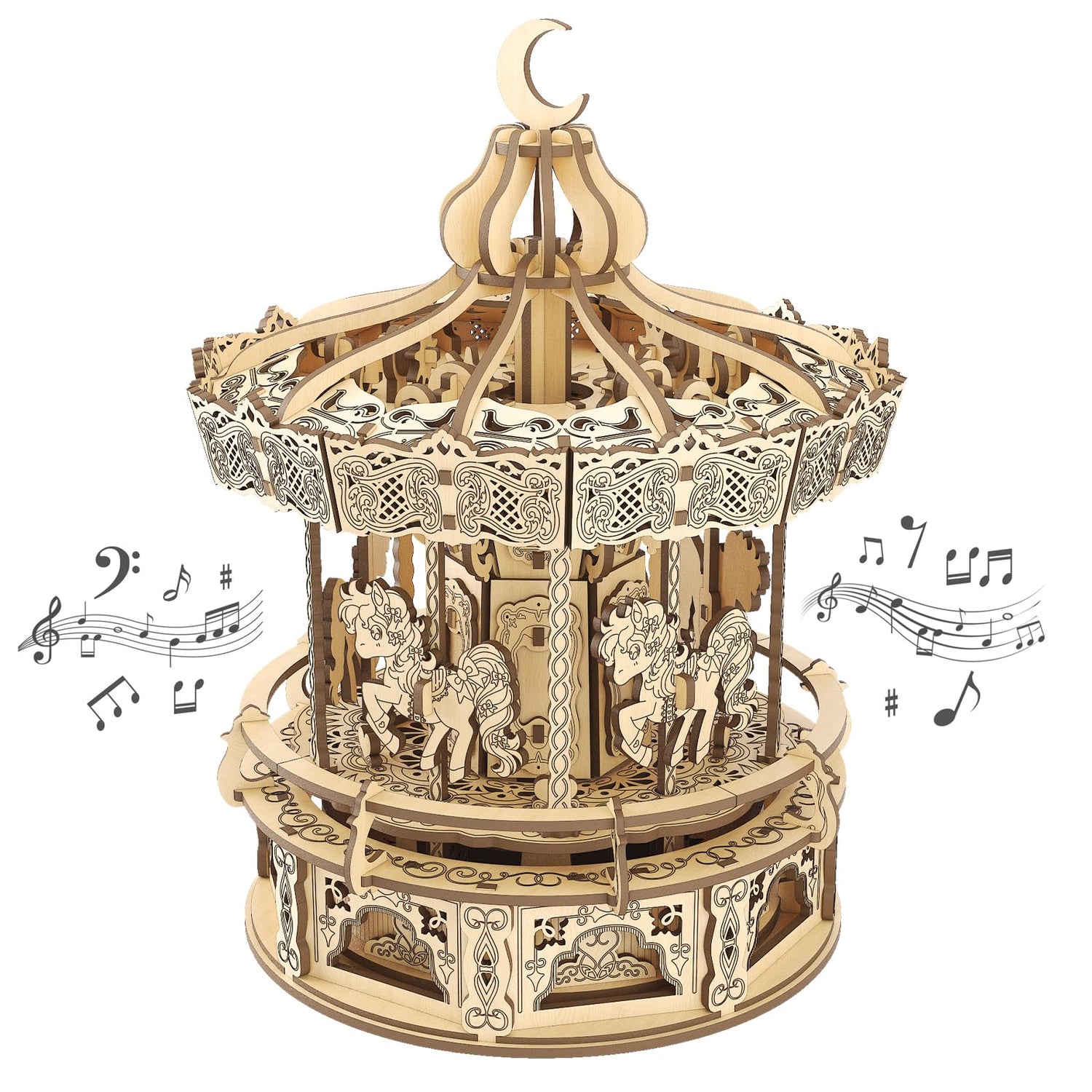 • Romantic Merry-Go-Round: The 3D wooden puzzle replicates a classic merry-go-round. With the beautiful melody of "Over The Rainbow", it rotates like a real carousel when wound up, and the horses move up and down simultaneously.