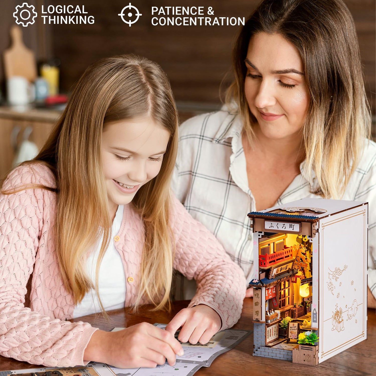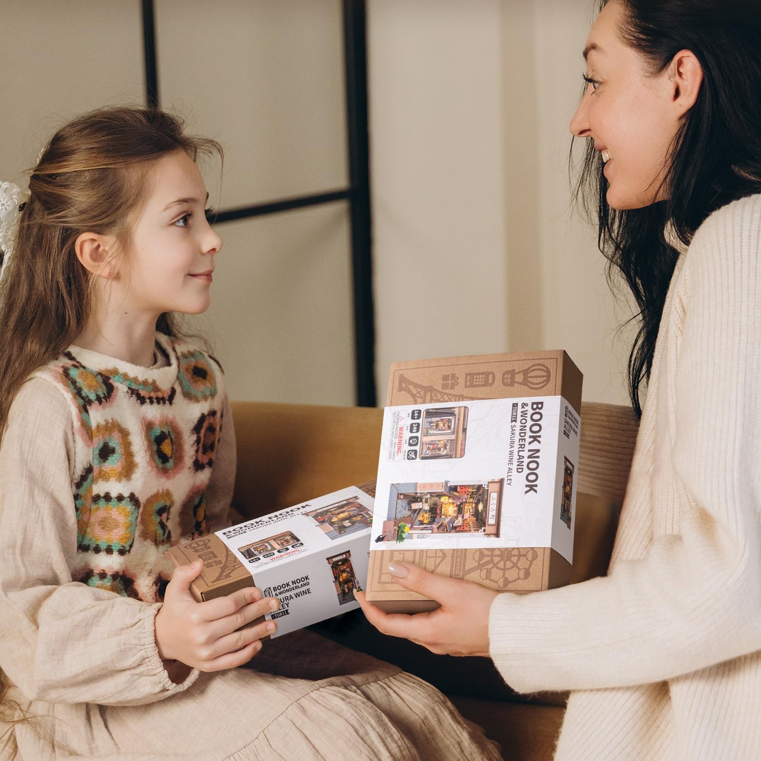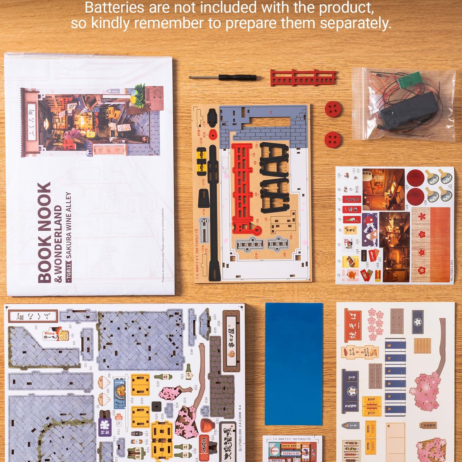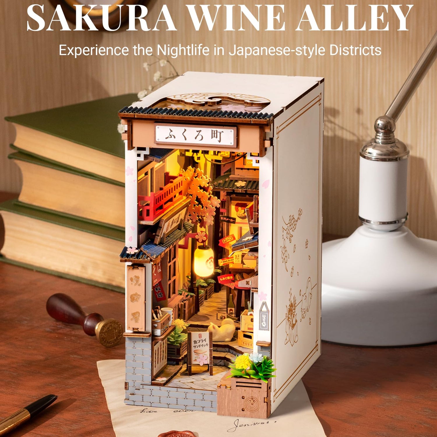 ROBOTIME Book Nook Kit DIY Miniature House Kit for Adults 3D Wooden Puzzle Bookends Bookshelf Diorama Insert Dollhouse Creative Decorative Unique Gifts for Teens and Beginners (Sakura Wine Alley)