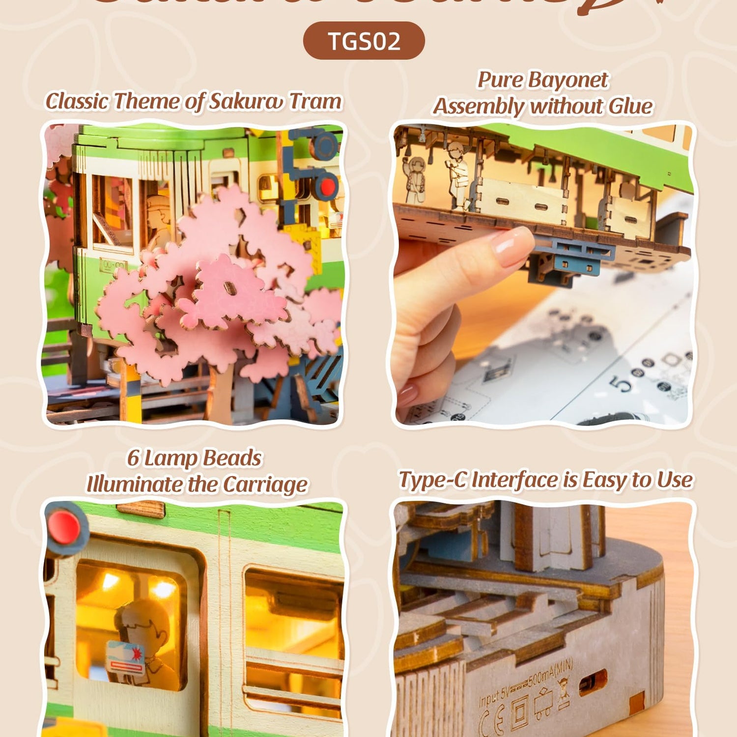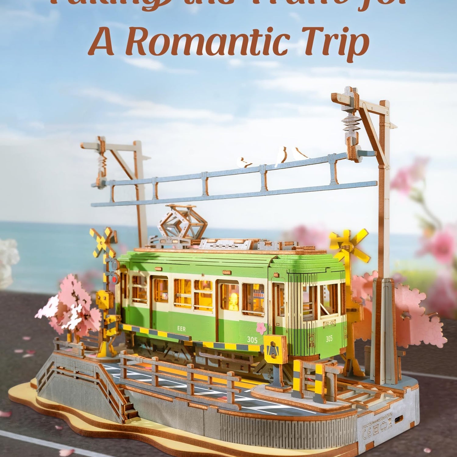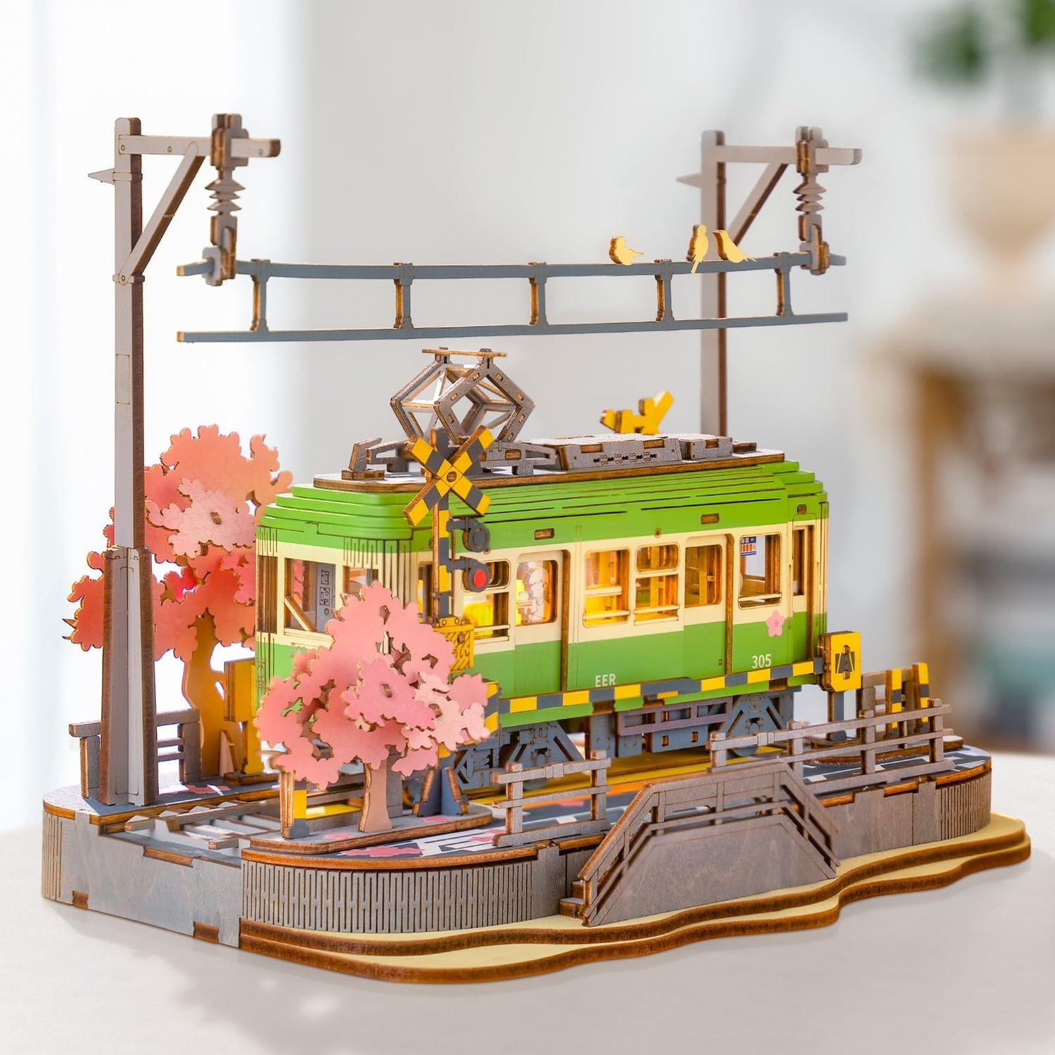 Rolife 3D Wooden Puzzle for Adults, Sakura Journey Tram DIY Model Building Kits with LED Lights, Creative Kids Craft Hobby Gift and Brain Teaser Home Decor Assembly Toy
